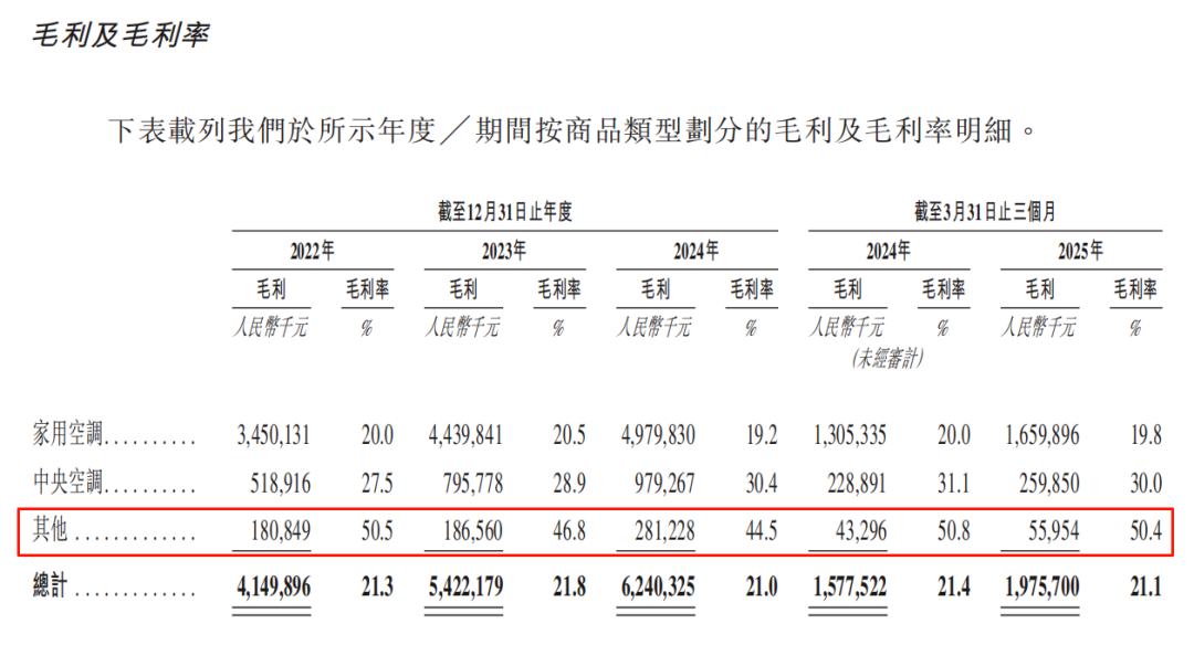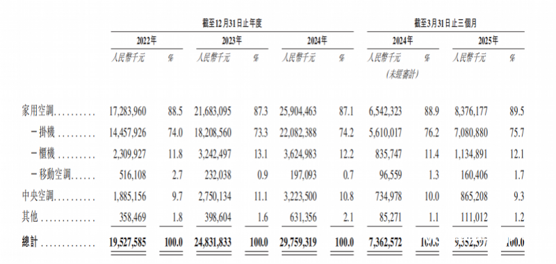 家用空调几乎贡献了全部营收,2022-2024年占比分别为88.5%、87.3%、87.1%,2025年一季度低端挂机占比高达75.7%。