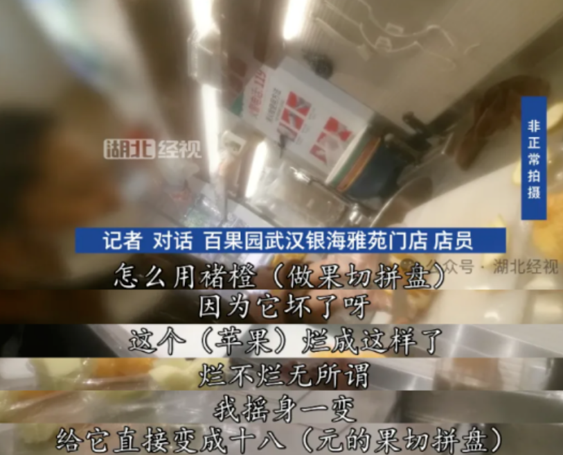 2024年“3·15”期间,有媒体曝光武汉一家百果园门店:用腐烂水果做高价果切、隔夜水果充当鲜果、随意更改车厘子等级;甚至员工连《食品健康许可证》都没有,就直接摆弄入口的水果。