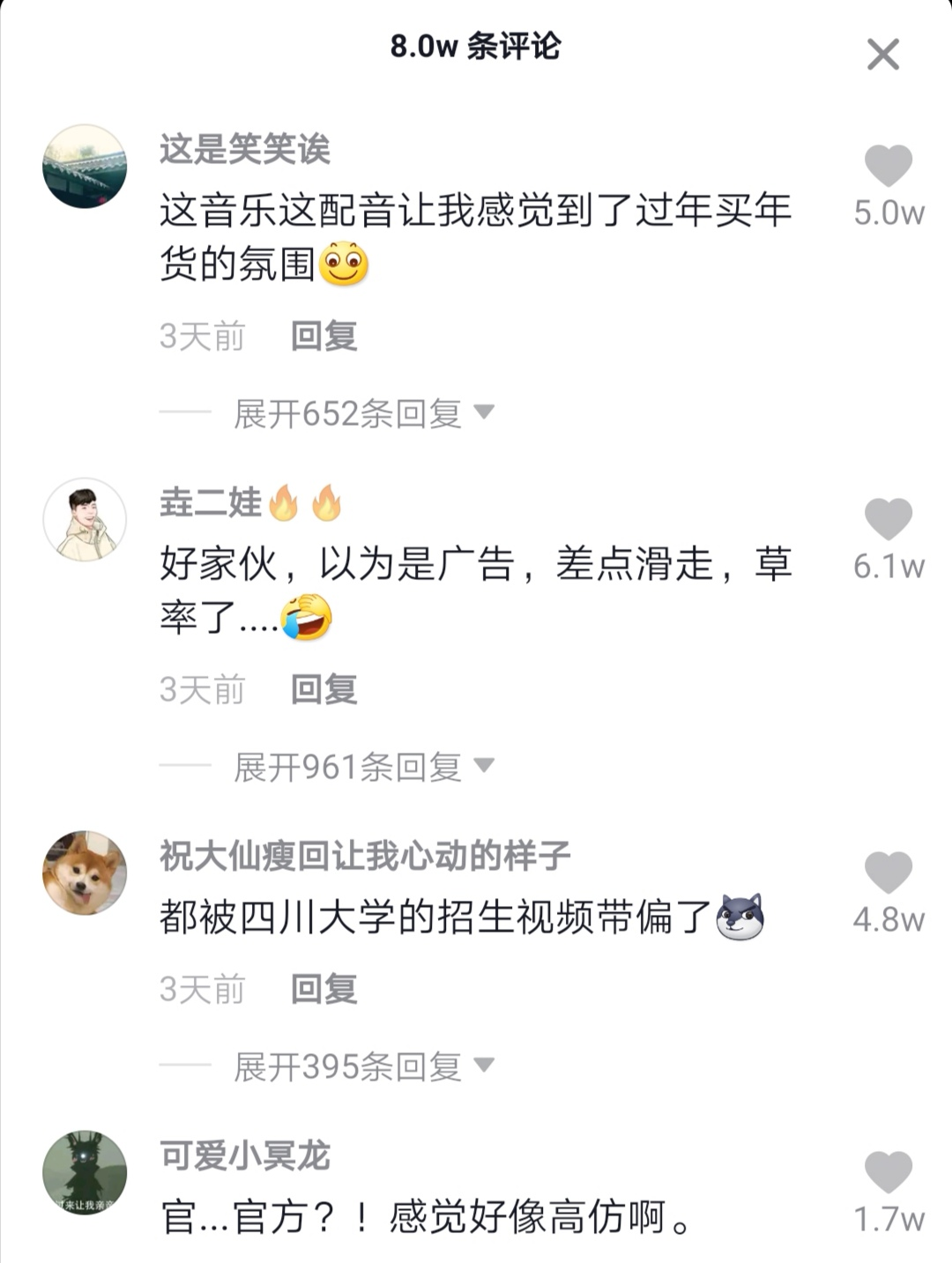 《姜子牙》的这支土味视频,更是在抖音收获了50w+赞,8w+评论互动,以及4w+分享转发,整个传播数据远超过官方账号的其他视频内容。
