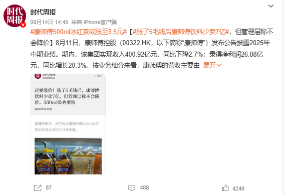 时代周报《还要涨价!涨了5毛钱后,康师傅饮料少卖7亿,但管理层称不会降价,500ml装也要涨》