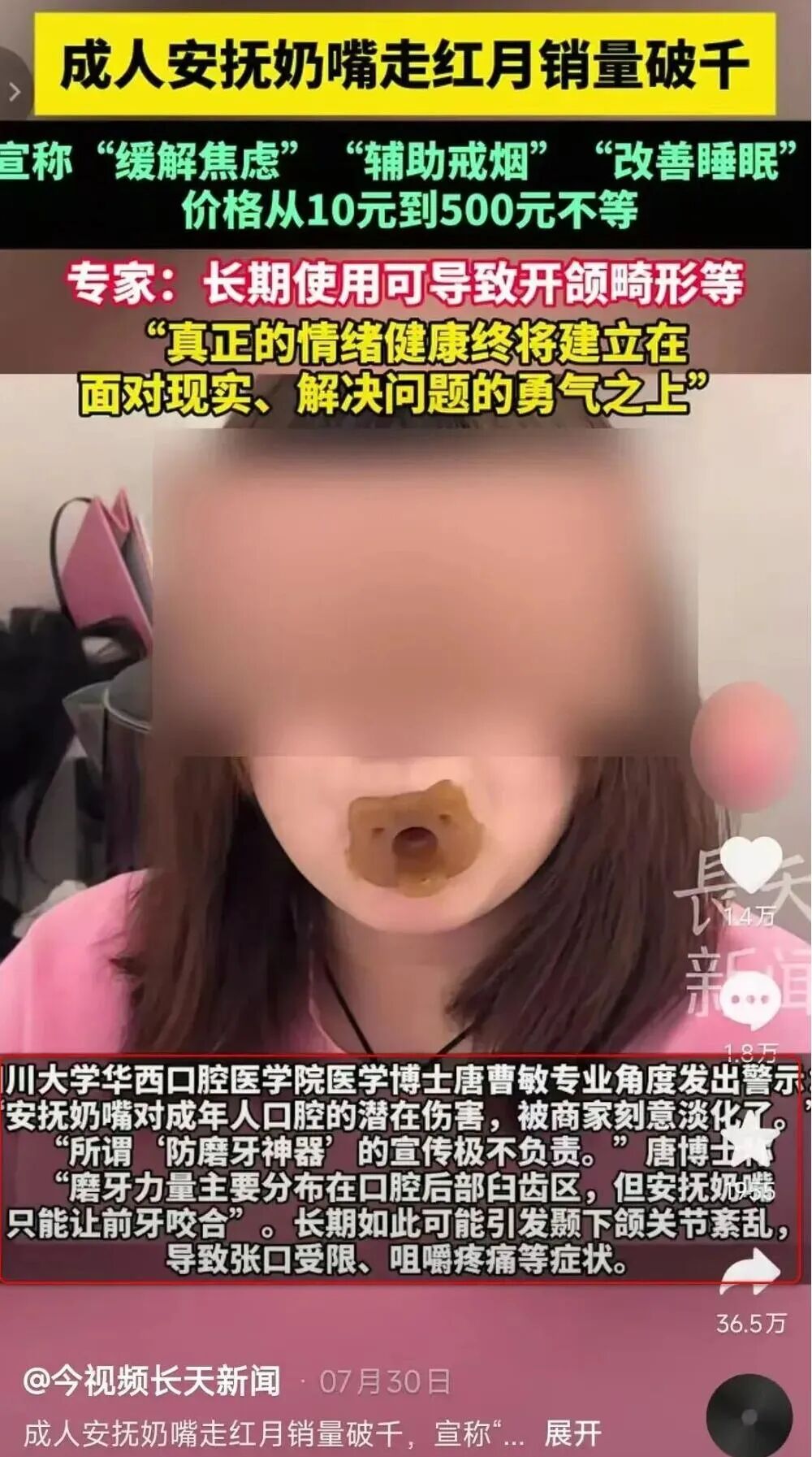 奶嘴带来的安慰很可能只是“表层的心理暗示”;过度依赖这类产品,可能掩盖焦虑的真正原因,让人陷入逃避循环。