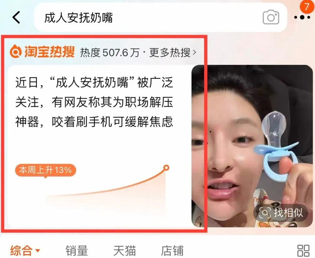 电商平台上,“成人安抚奶嘴”的搜索量一夜暴增,部分店铺月销轻松突破七千件,爆款单品甚至冲到五万件。