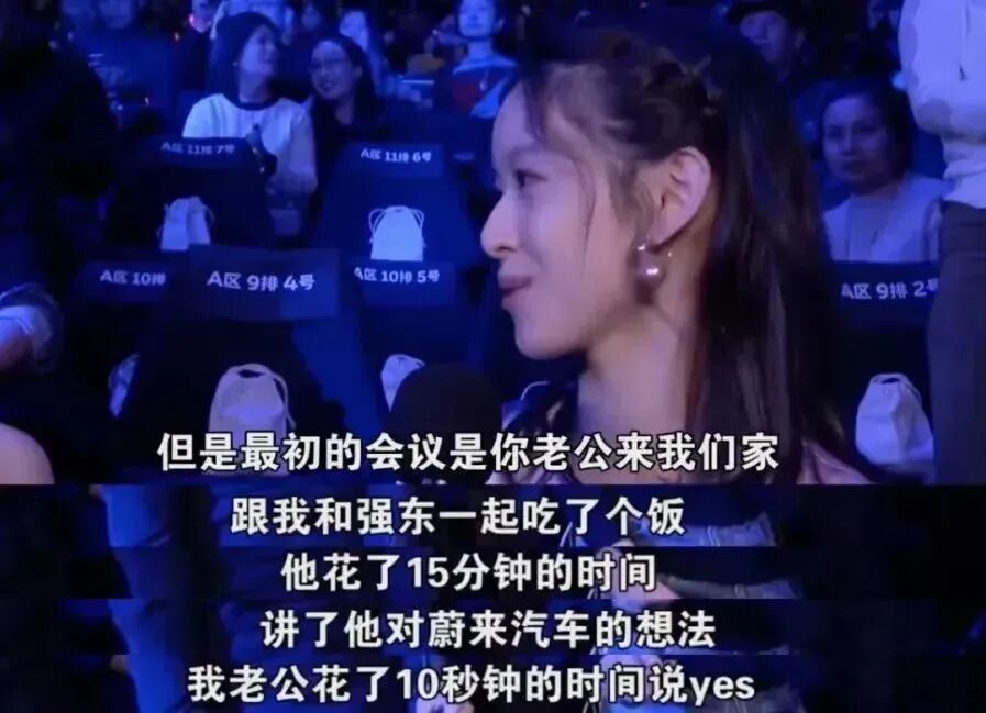 “最初的会议是李斌来我们家,跟我跟强东吃了顿饭。他花了15分钟讲了他对蔚来汽车的想法,我老公花了10秒说yes”,这是章泽天谈起的京东投资蔚来的整个过程。