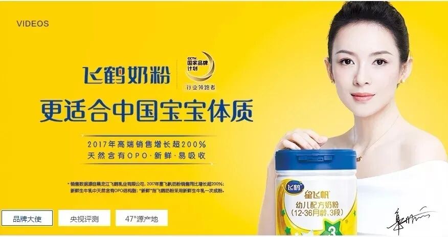 为进一步提升品牌力量,飞鹤与国际巨星章子怡达成了合作。2018年2月,章子怡作为飞鹤新品牌形象大使,出席“高质量陪伴,高端升级”产品发布会。毋庸置疑,选择章子怡作代言人的飞鹤独具慧眼,这一顶流IP不仅具有“高品质”标签,也因为二胎妈妈身份非常有“带入感”。