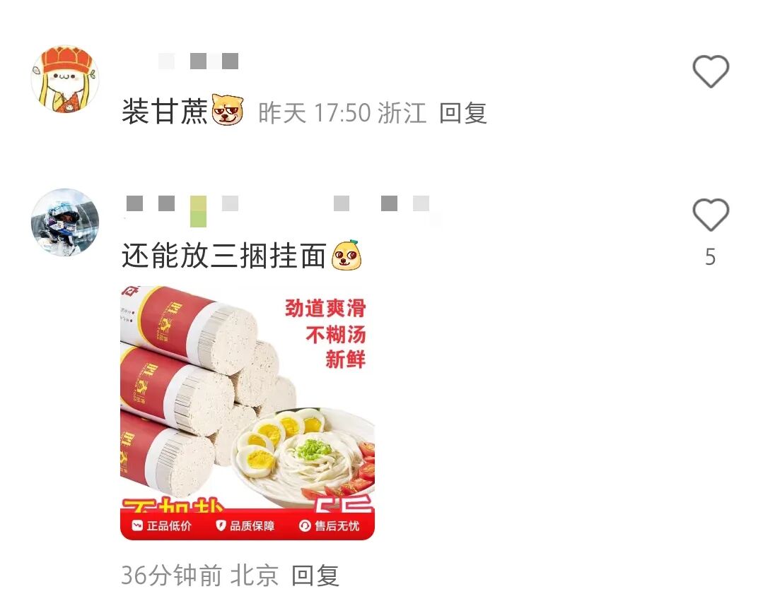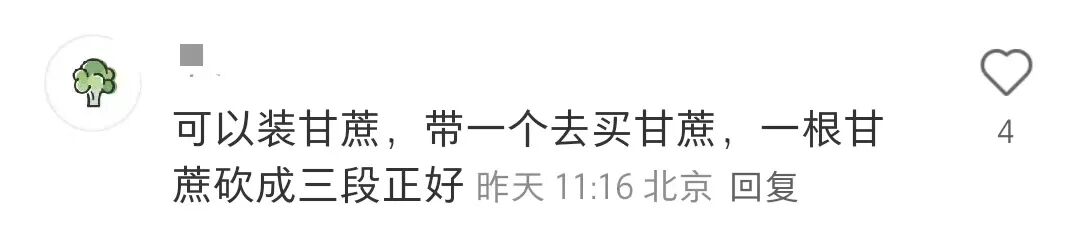 机智的网友想出了其它用途,可以装甘蔗,带一个去买甘蔗,一根甘蔗砍成三段正好~