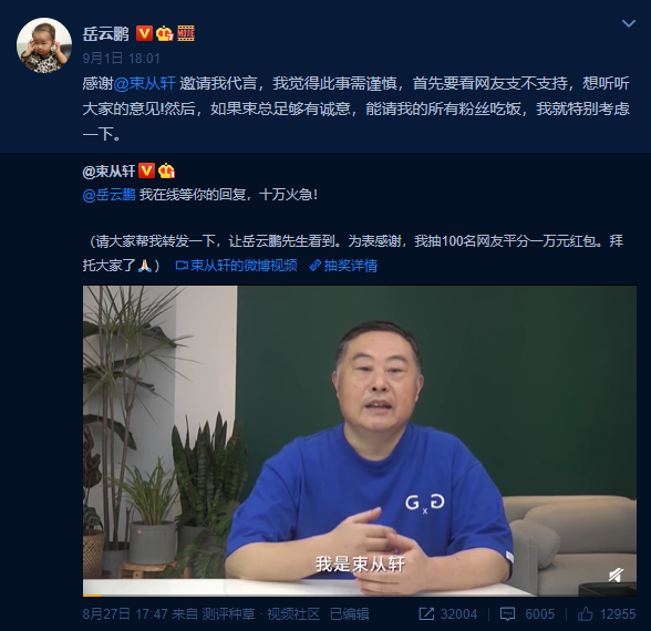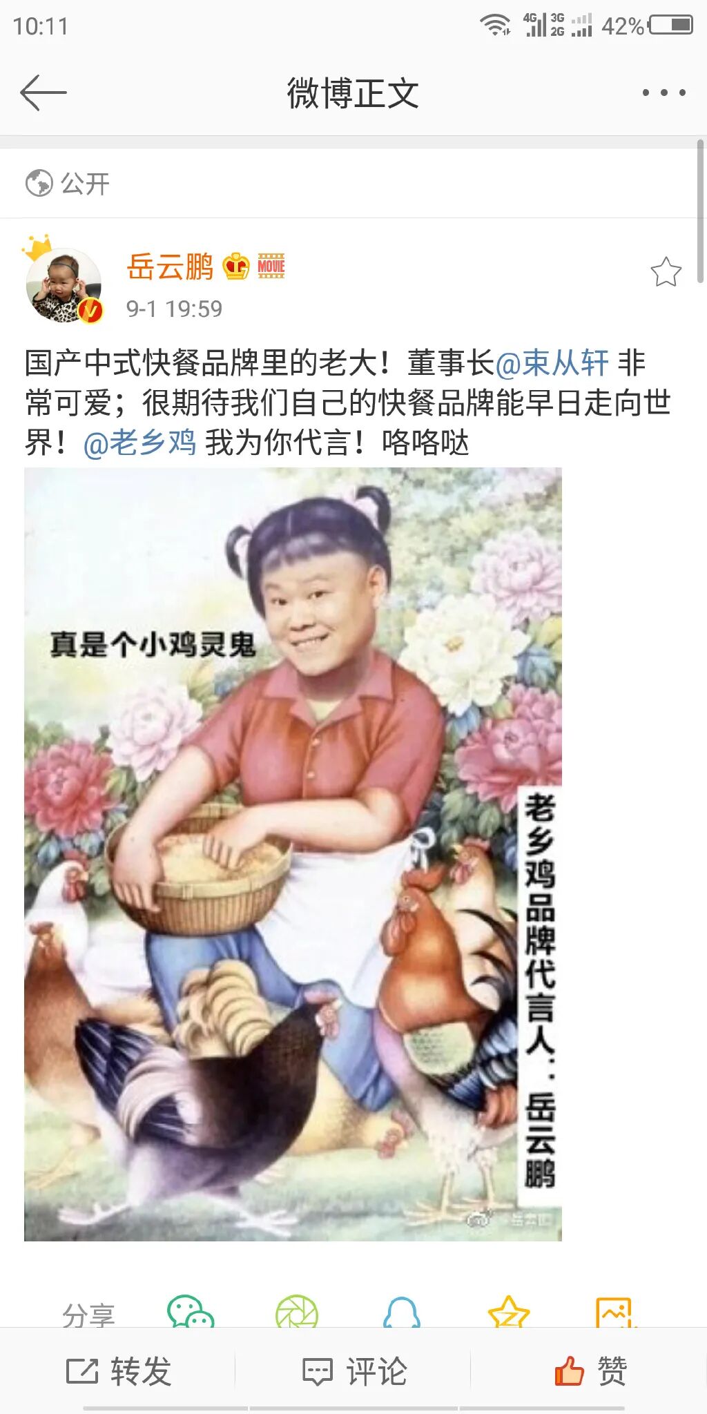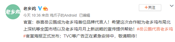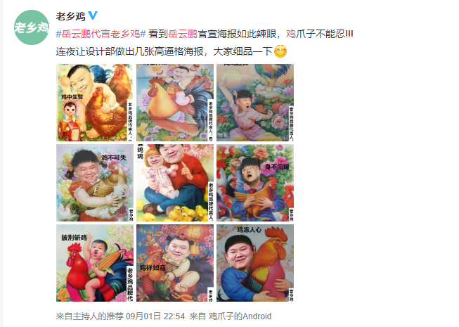 还记得前几天 老乡鸡 董事长在微博隔空邀请小岳岳作为老乡鸡品牌代言人的事情吗?为布局北上广深等全国市场市场以及“月月上新”战略,中式快餐榜首老乡鸡董事长束从轩在线喊话岳云鹏代言。就在今日(9月2日)上午,老乡鸡终于官宣:小岳岳成为首位品牌代言人!其实就在前一日晚,小岳岳就在微博回复了老乡鸡董事长的隔空邀请:不多时,老乡鸡发布了几张“连夜让设计部做出”的“高B格”海报,回应小岳岳: