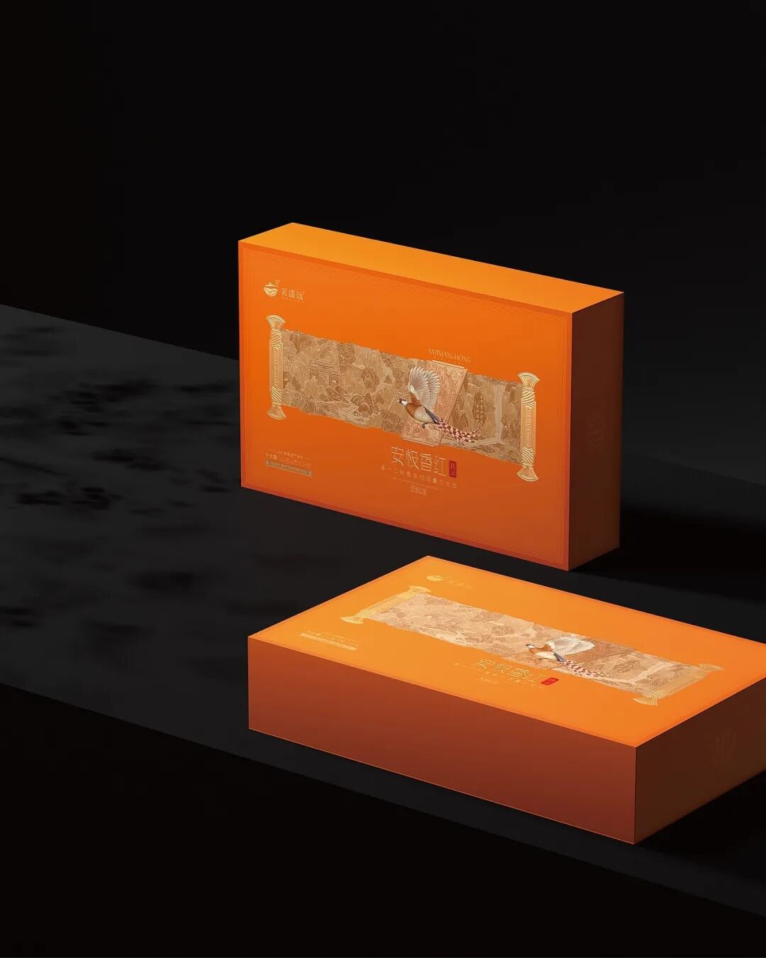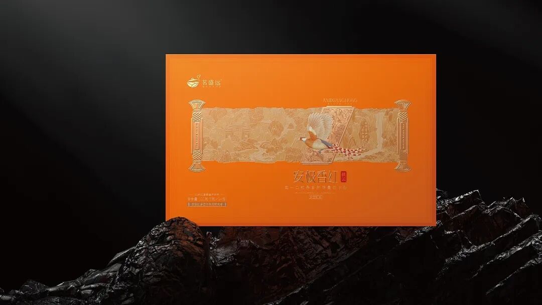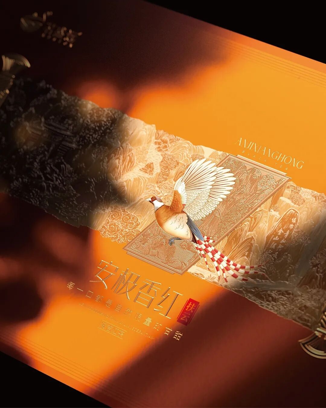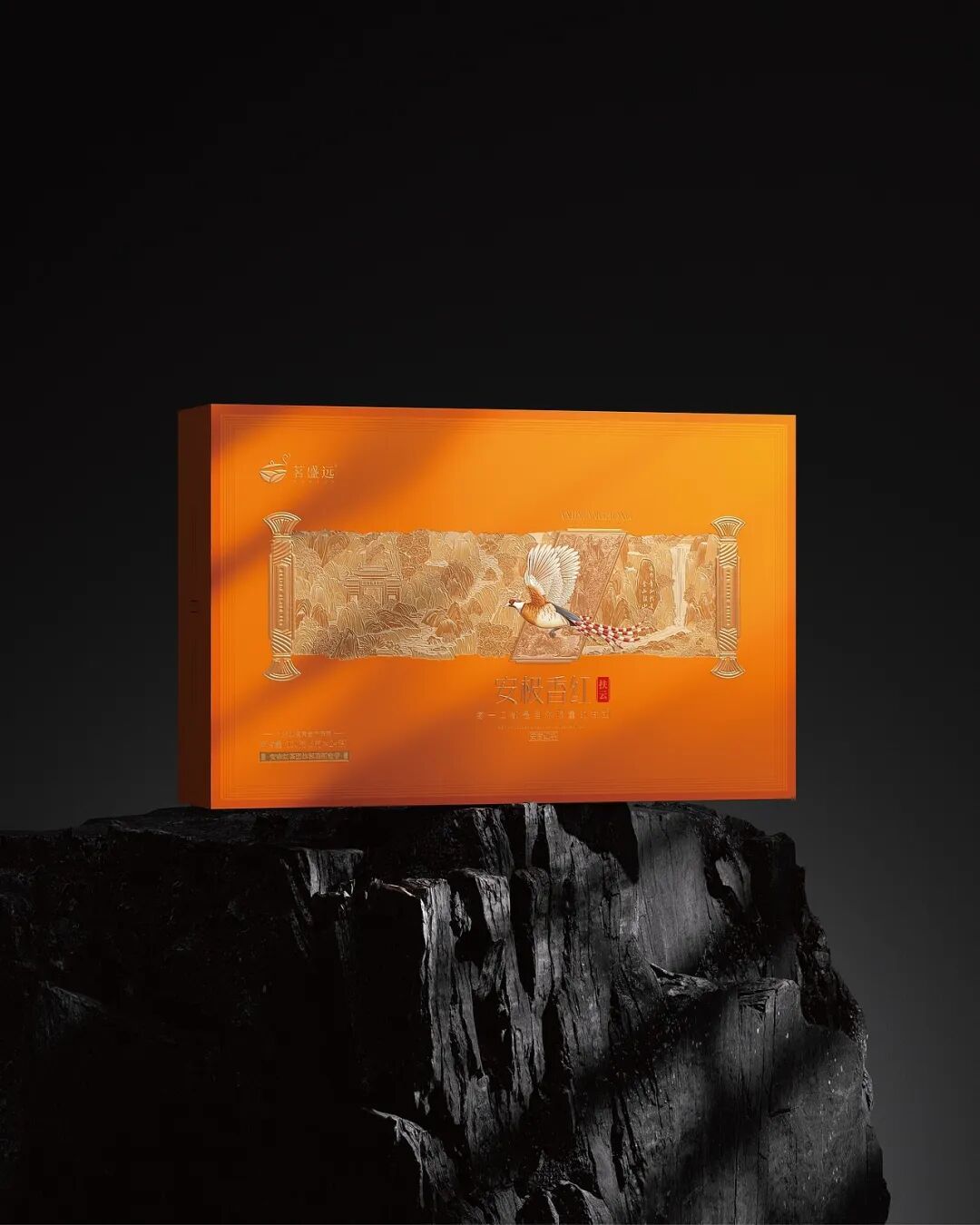 第二款安吉红茶,以中式笔触勾勒山场生态,用设计对话传统脉络,解构国茶美学的全新语言,从一盏茶汤里,触摸东方意境。色彩方面,以暖橙为主色调,搭配浮雕卷轴纹样与鸟形元素,传递出茶的原生质感,又以精致的工艺凸显高端属性,让 “每一口都是自然香” 的理念具象化。