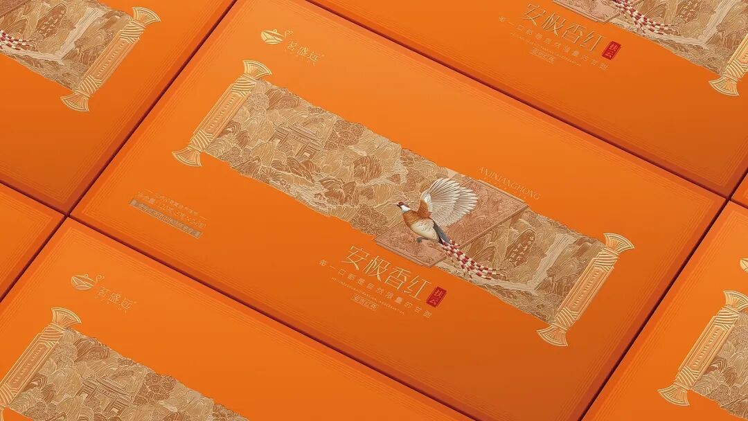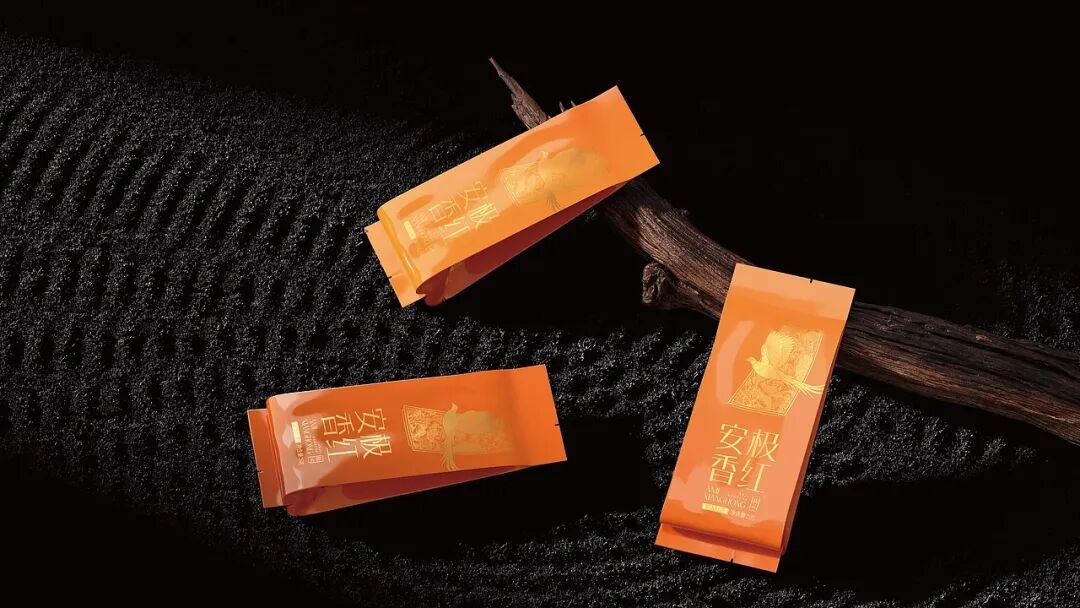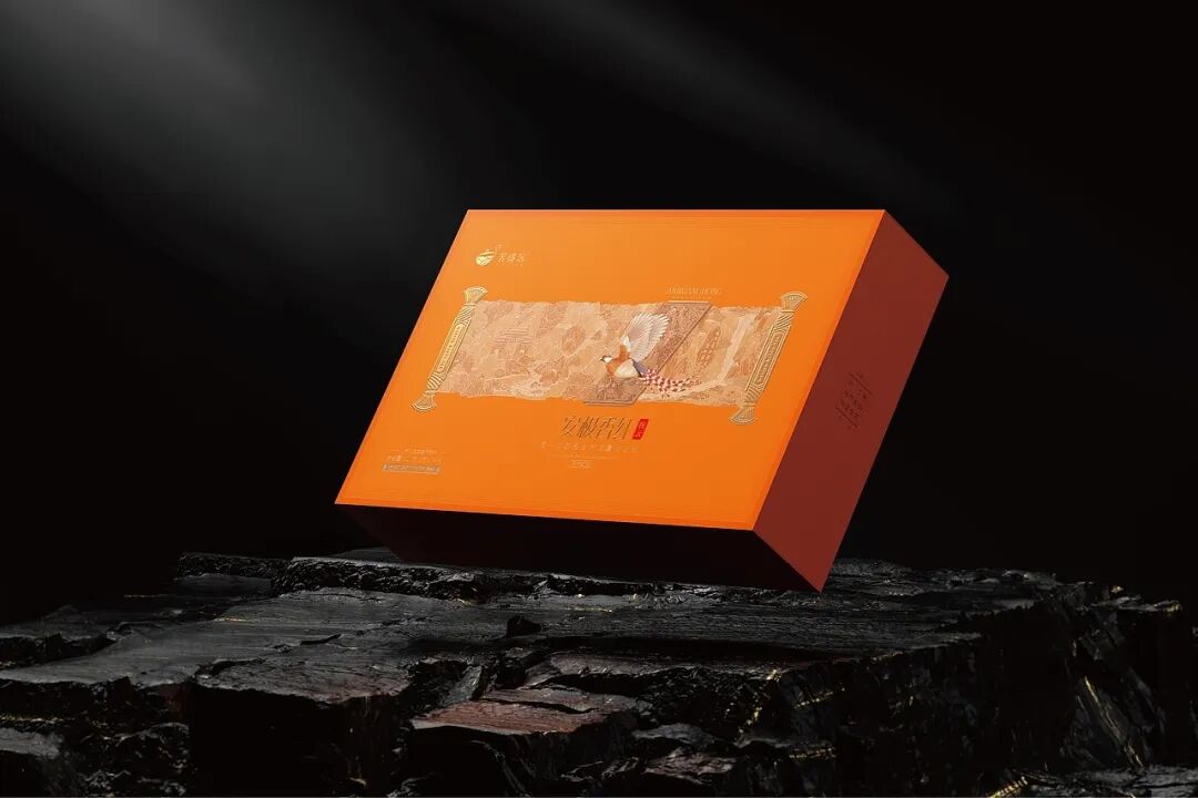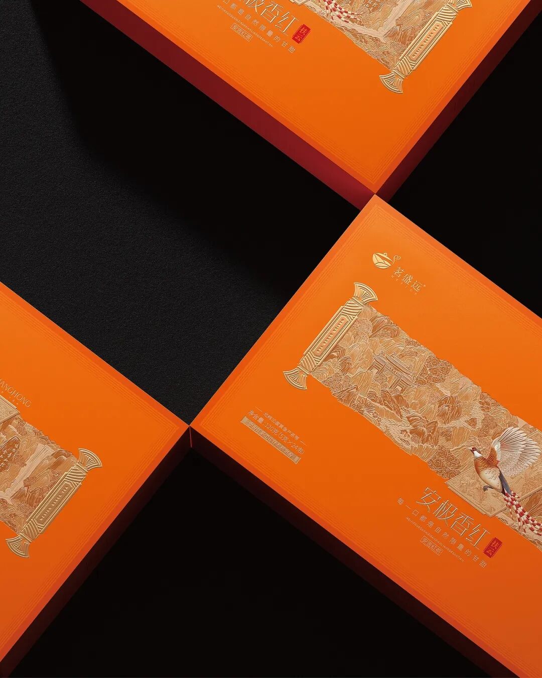 第二款安吉红茶,以中式笔触勾勒山场生态,用设计对话传统脉络,解构国茶美学的全新语言,从一盏茶汤里,触摸东方意境。色彩方面,以暖橙为主色调,搭配浮雕卷轴纹样与鸟形元素,传递出茶的原生质感,又以精致的工艺凸显高端属性,让 “每一口都是自然香” 的理念具象化。