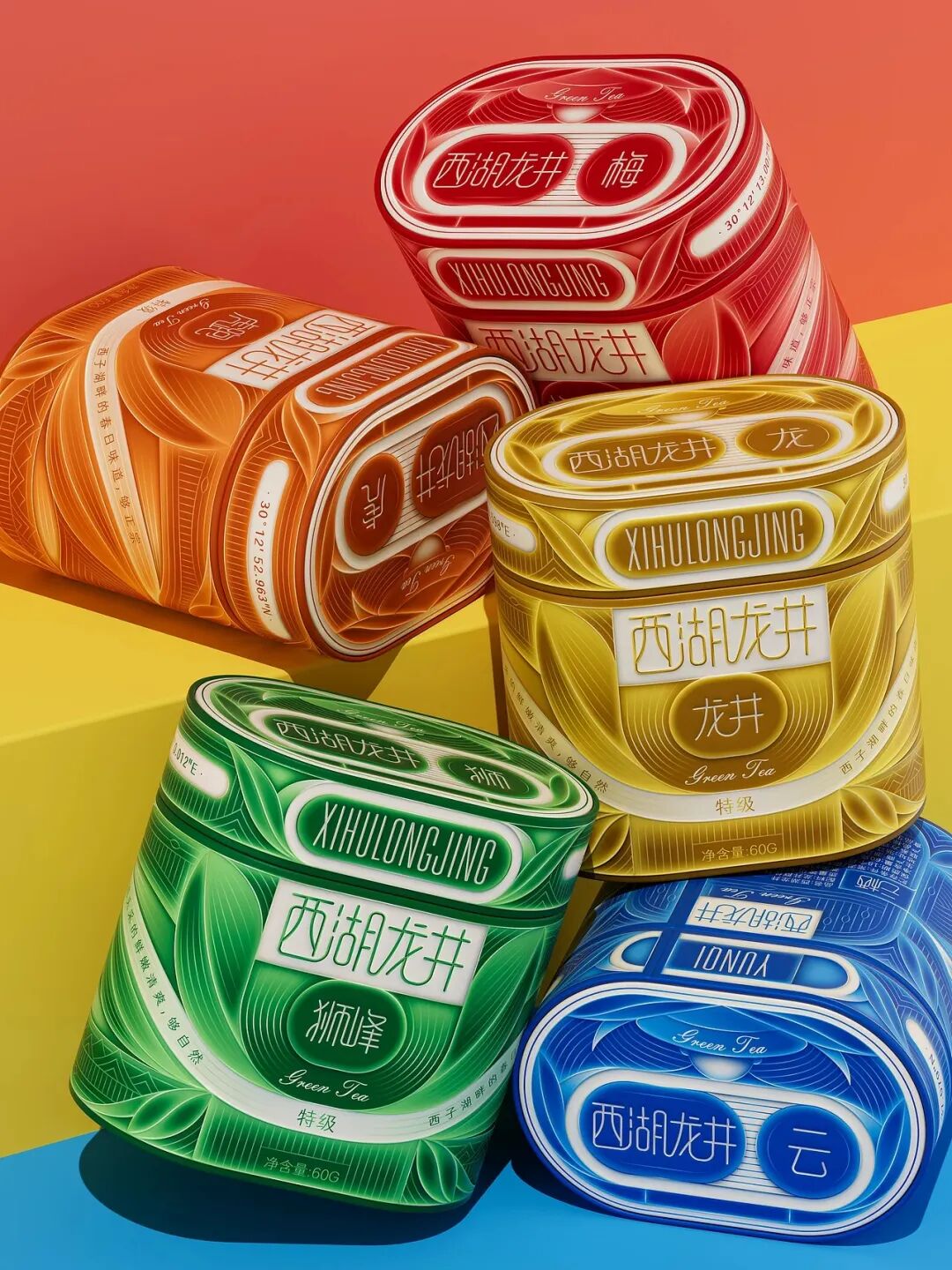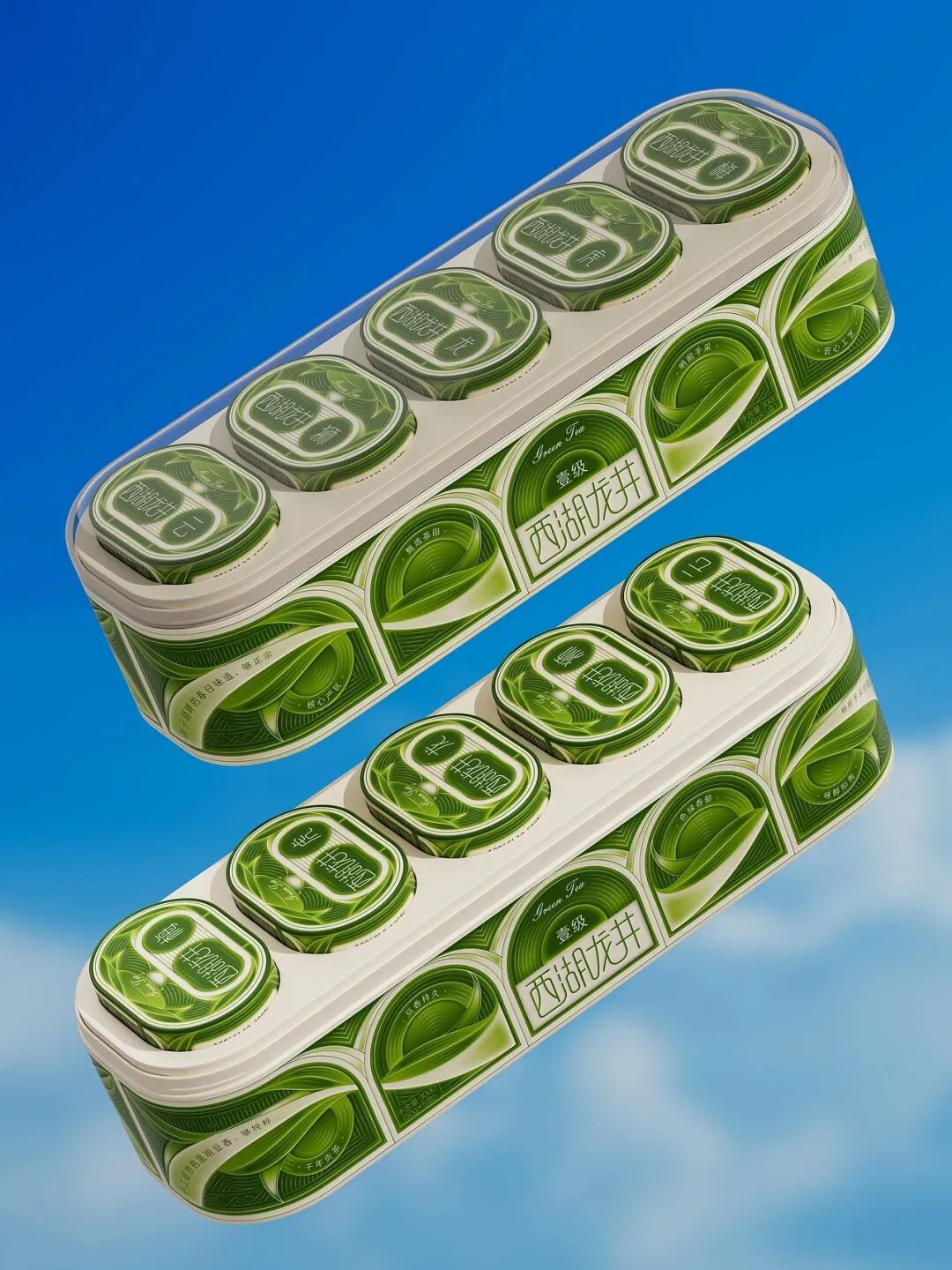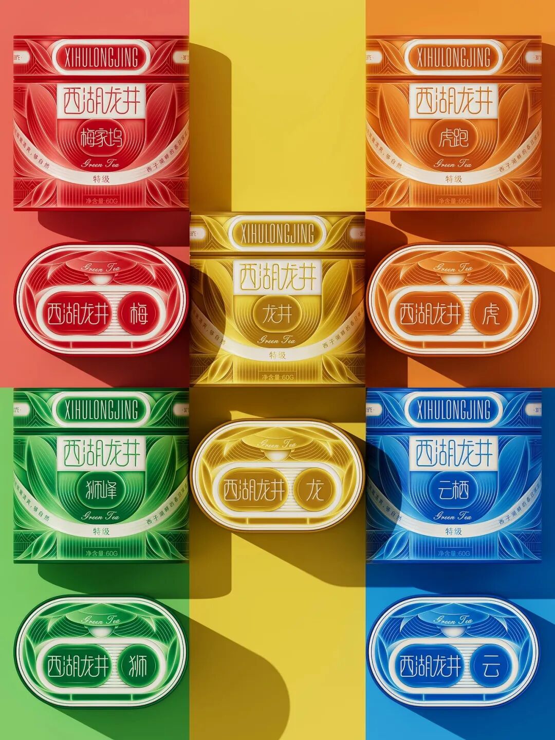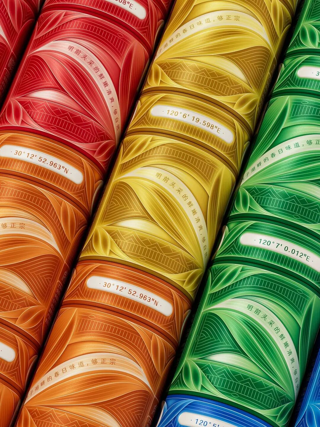 最后这款西湖龙井系列茶,包装以色彩区分茶的品类,罐身的叶脉纹理与地理坐标细节,强化产品的地域属性,又以组合式礼盒的形态传递出 “茶之万象” 的概念,用鲜活的视觉层次打破传统茶包装的厚重感,适配年轻消费群体的审美偏好。