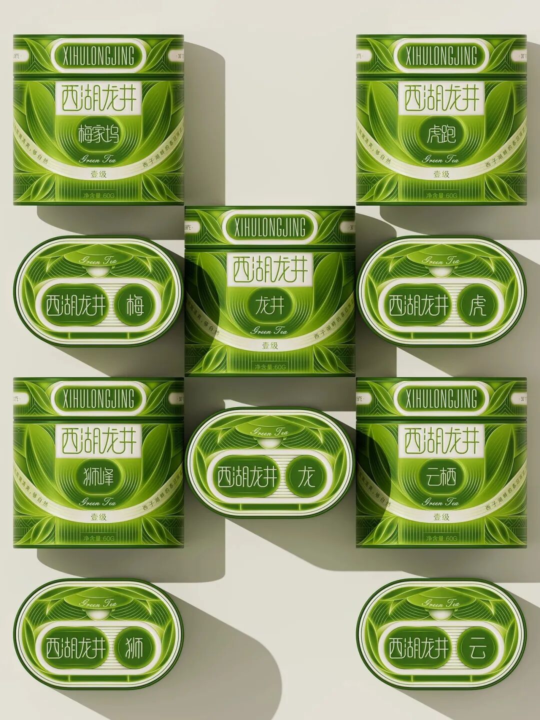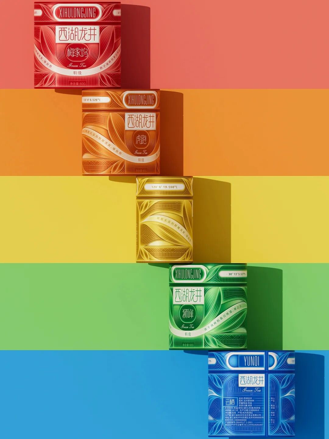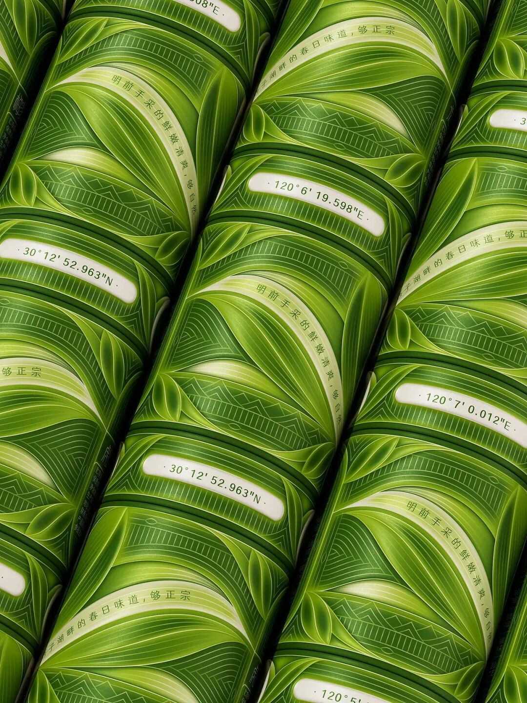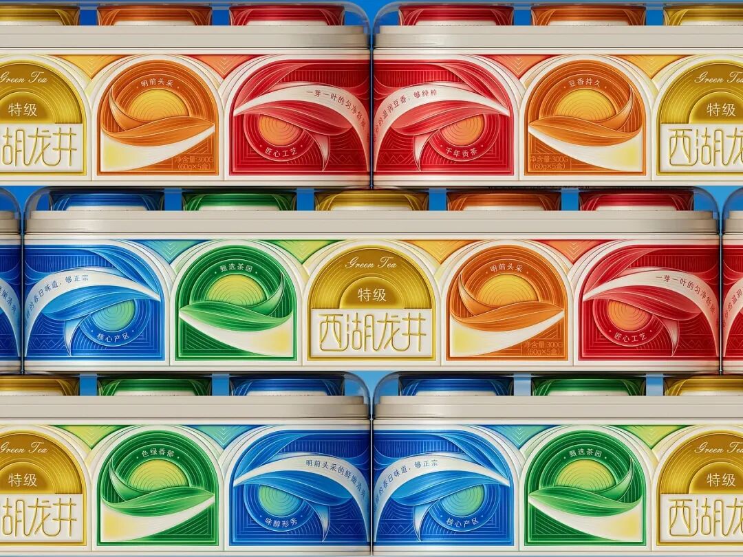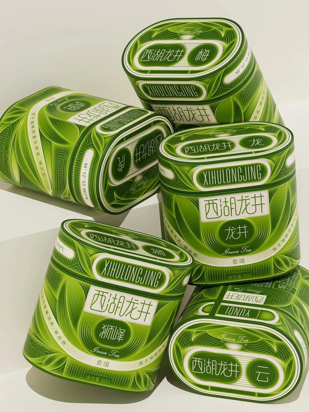 最后这款西湖龙井系列茶,包装以色彩区分茶的品类,罐身的叶脉纹理与地理坐标细节,强化产品的地域属性,又以组合式礼盒的形态传递出 “茶之万象” 的概念,用鲜活的视觉层次打破传统茶包装的厚重感,适配年轻消费群体的审美偏好。