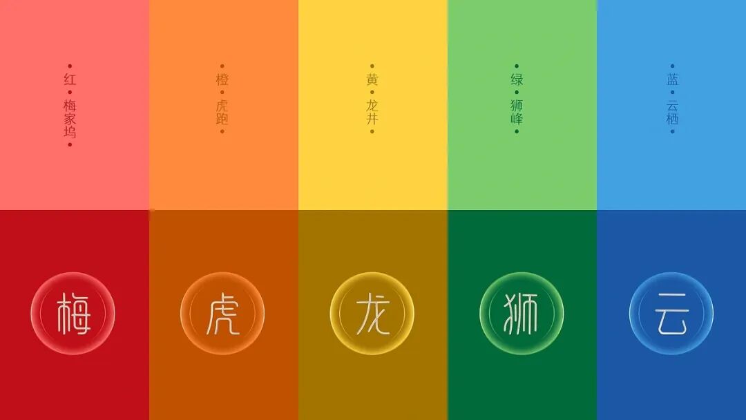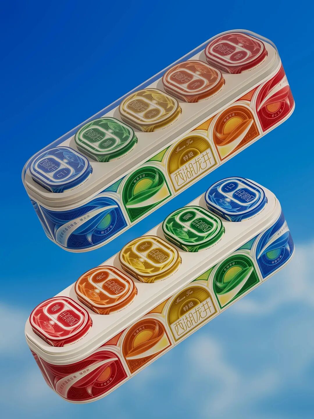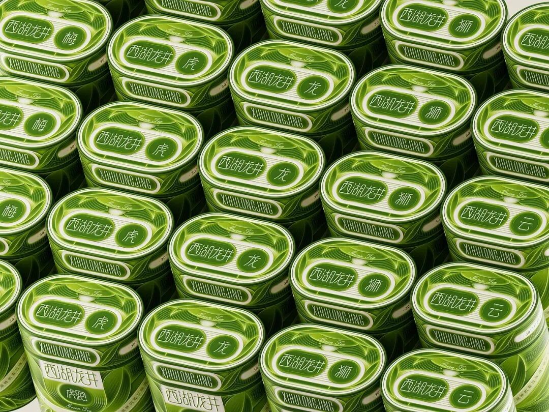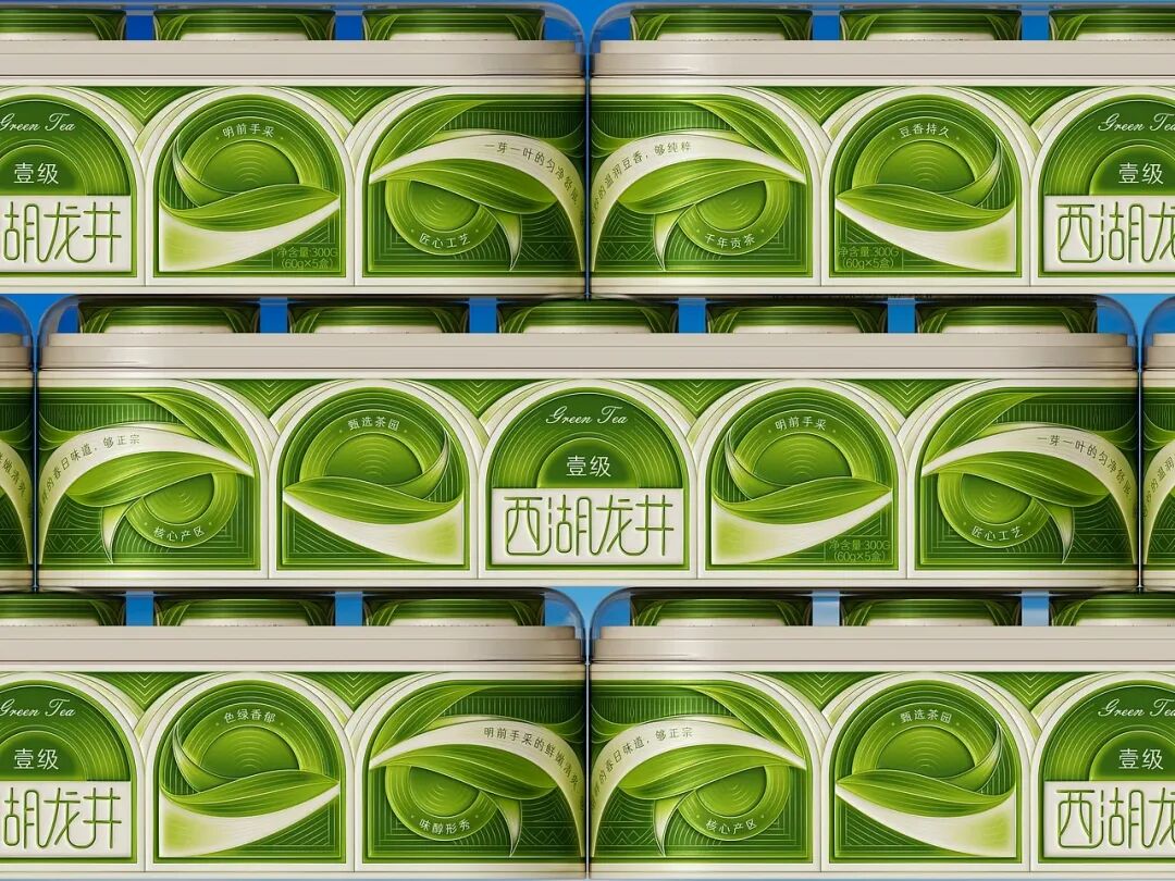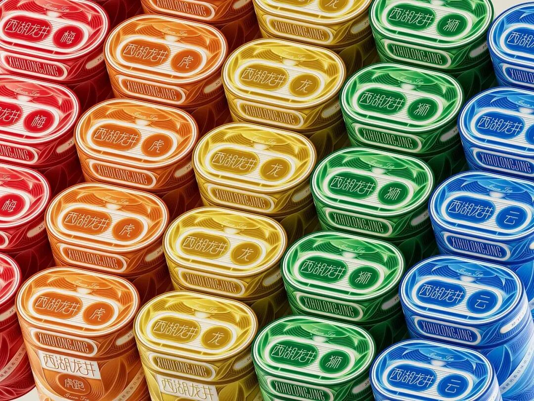 最后这款西湖龙井系列茶,包装以色彩区分茶的品类,罐身的叶脉纹理与地理坐标细节,强化产品的地域属性,又以组合式礼盒的形态传递出 “茶之万象” 的概念,用鲜活的视觉层次打破传统茶包装的厚重感,适配年轻消费群体的审美偏好。