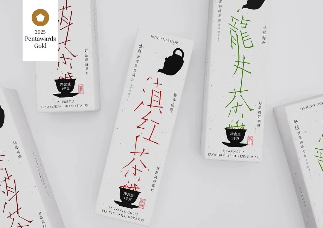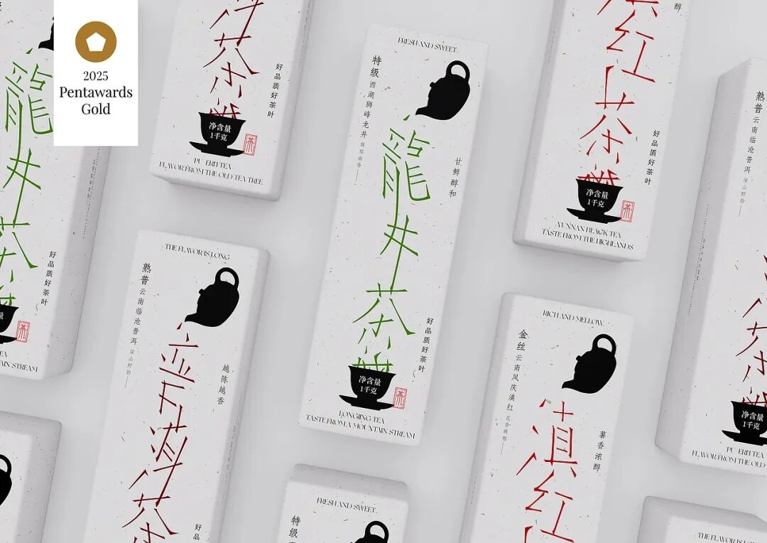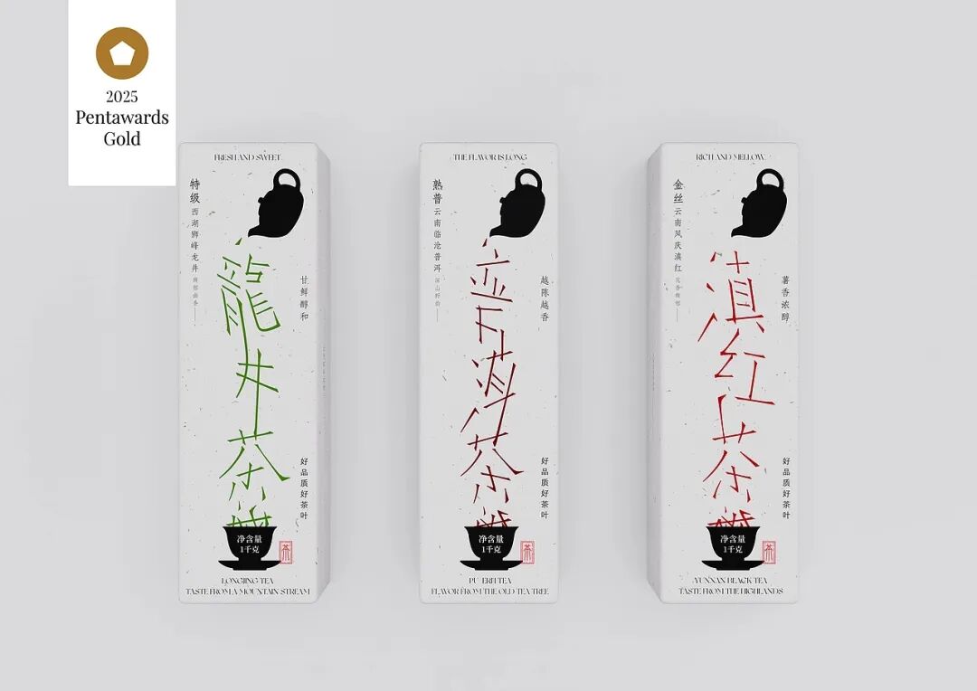 这款包装设计灵感,源自倒茶时的流动感,以宋体为基础,将“普洱茶”、“龙井茶”、“滇红茶”等字样的笔画拆分重组,赋予文字如流水般的灵动感。在保证文字辨识度的情况下,每笔一划的排列都精雕细琢,细长锐利,彰显书法韵味。