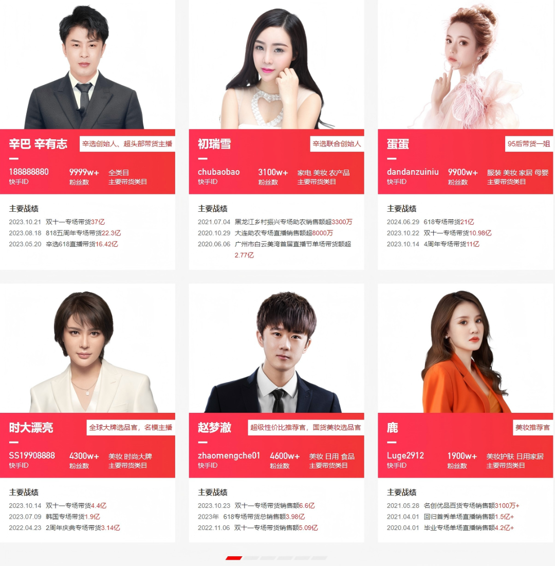 2024年9月成为全网首个粉丝破亿的女主播,坐稳“快手一姐”宝座。