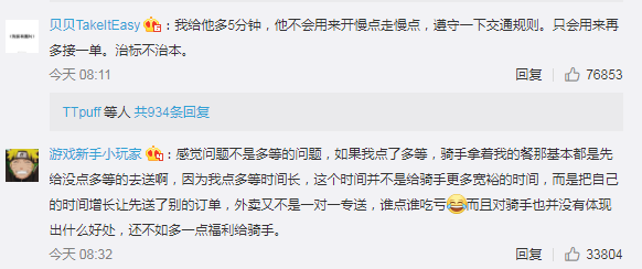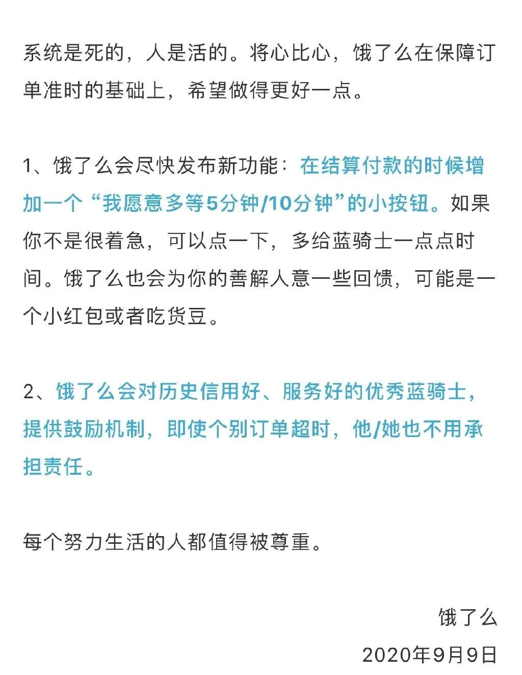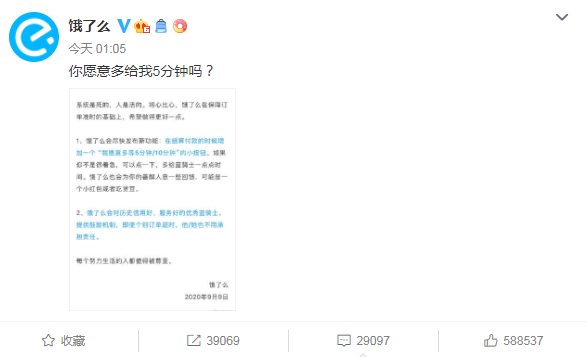 饿了么相当重视,9日凌晨1点就发布了一份“你愿意多给我5分钟吗?”的回应。表示尽快发布“我愿意多等5分钟\10分钟”的新功能,并大打感情牌。