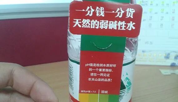 在2006年左右,农夫山泉还搞了一波“饮用水酸碱度测试”的广告。它呼吁人们在喝水之前,先用PH试纸测一测水的酸碱性,如果像农夫山泉一样显示的是绿色就是健康好水;而如果显示的是黄色(康师傅),那就是对人体有害的水。