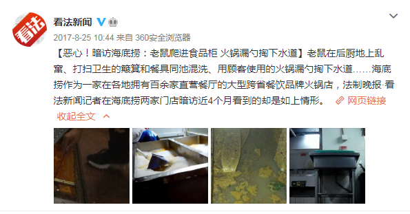 当时,来自《法制晚报》下的“看法新闻”披露海底捞后厨脏乱差,甚至有老鼠爬进食柜里。随着报道的发出,海底捞一度被推向舆论的风口浪尖。
