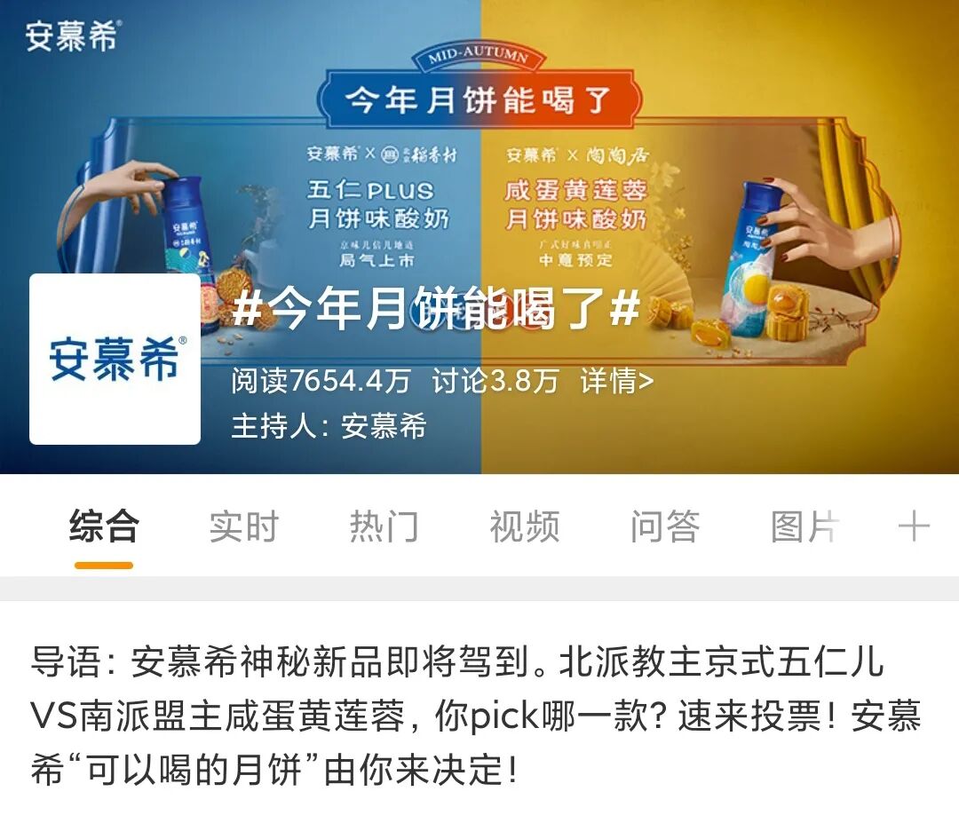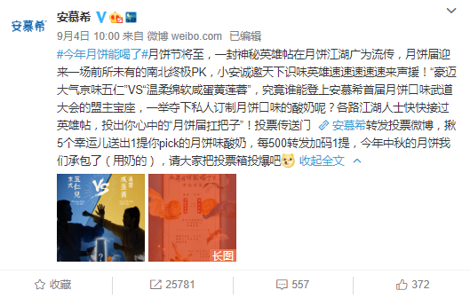 在9月4日,安慕希进行了首波中秋预热活动。预热以南北方月饼口味偏好的差异为出发点,引导网友进行两种口味投票,而投票结果则影响最终月饼口味的呈现。
