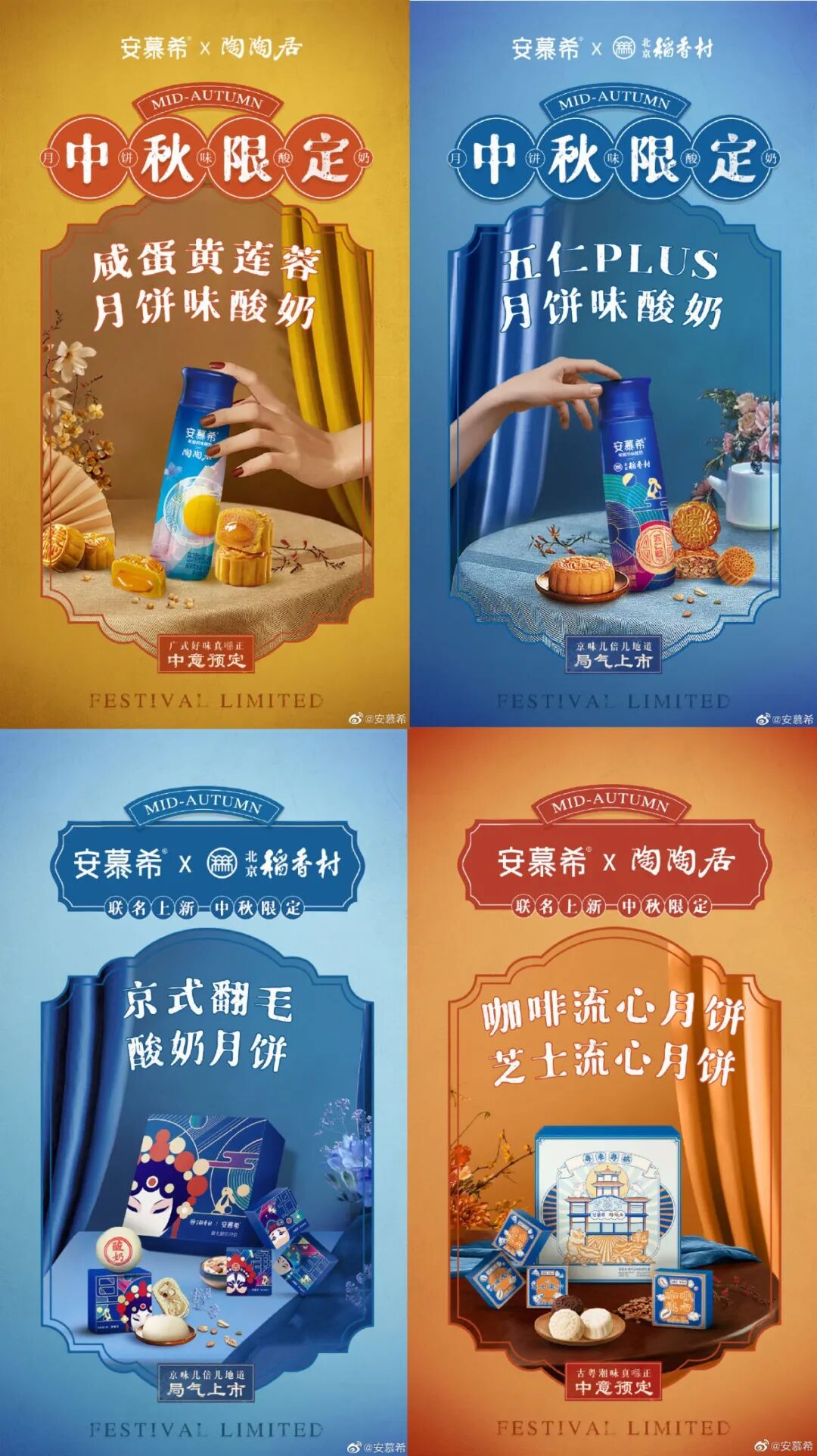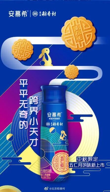 在一众跨界中,安慕希通过“喝月饼”的宣传点成功脱颖而出。安慕希携手北京老字号稻香村与广州老字号陶陶居酒家推出五仁PLUS月饼味与咸蛋黄莲蓉味酸奶。