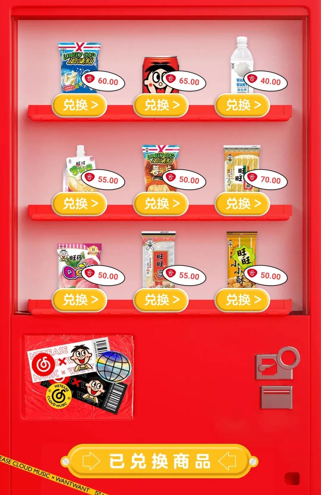 在潮酷歌曲上线的同时,双方也正式宣布「网易云听歌免费吃旺旺」活动的开启。旺旺方,全国147个城市的5000台旺旺售货机均参与云贝兑换活动。