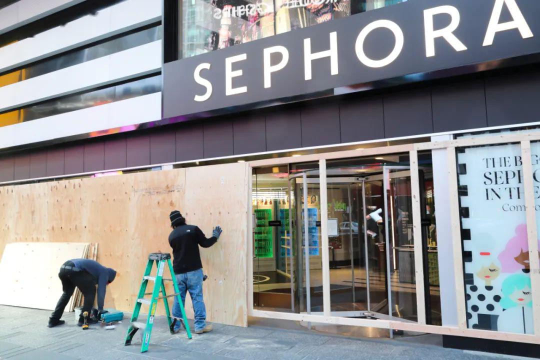 因担心未来社会动荡,盗匪砸窗,美国纽约包括奢侈品店在内的很多商铺将门店橱窗封上木板。图为纽约时报广场,工人用木板封闭SEPHORA门店,SEPHORA隶属于LVMH集团。图据新华社