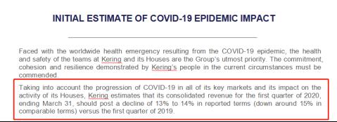 旗下拥有Gucci、Saint Laurent、Bottega Veneta等品牌的Kering集团,亦受到新冠肺炎的猛烈冲击,预计公司今年一、二季度都会受到影响。在近期一份初步预估结果中,Kering集团表示,“截止到3月31日的2020财年第一季度,Kering集团收入较上年同期将下滑13%~14%。”随后,Kering集团相关人士也向每经记者证实了这份预估报告的真实性。