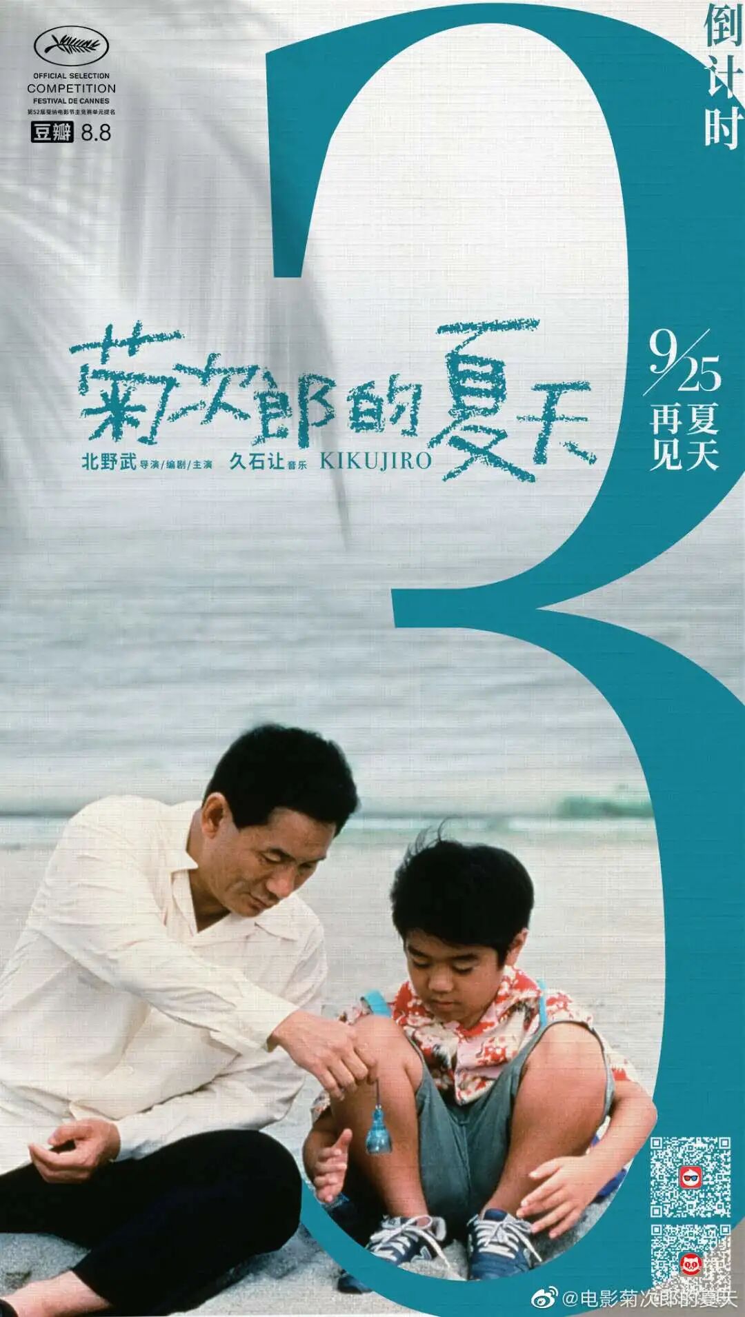 影片主要讲述了自幼丧父、与奶奶生活在一起的小学生正男,为了寻找生母,而和邻居阿姨家“不靠谱”的老公菊次郎,在暑假踏上了一场充满奇遇和温情的夏日之旅。然而,就是这样一部经典之作,此前却未曾登上过中国内地的大荧幕。终于,在这个夏天,《菊次郎的夏天》决定来到中国。不过,作为一部首映已久又颇受好评的经典影片,相信很多人早已在线上看过该片了。那么这一次,它带着修复版登陆中国内地院线,还会有人专门跑到电影院去看吗?关于这个问题,看看下面这支官方发布的创意宣传片,或许你就能找到答案了。很特别地,这支电影预热宣传片,既不讲剧情,也没有任何与电影相关的画面,而是通过问答的形式,直接回应了大众对电影上映的疑虑与困惑。整个对话轻松幽默却不失哲理。紧跟在每个问答之后,还有一句简单明了的文案,扼要地传达了电影知名度大、观影体验好、粉丝忠实度高等优势。此外,充满童趣的手绘动画以及俏皮可爱的配音,也很好地展现出了电影那种清新治愈的感觉。因此,观看短片过程中,即使被人叫了九次“笨蛋”,也不会感到厌烦,反而勾起了观看电影的欲望。而除了上面这支预热宣传片之外,《菊次郎的夏天》还曾发布过一系列内地版海报。显而易见地,这些海报都十分清新治愈,充满夏天的气息。