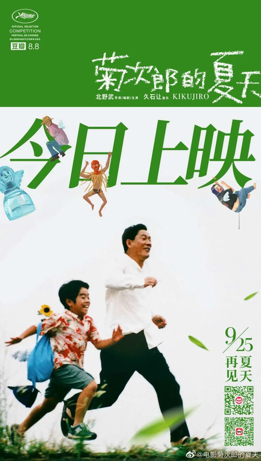 《菊次郎的夏天》中国版海报,由著名设计师黄海亲自操刀设计,画风可爱、色调清新,还融入了代表幸福的天使风铃,可谓创意满满、有趣又有内涵。与此同时,这张海报还制作了动态版本,搭配着久石让的经典配乐《summer》,夏日气息扑面而来。