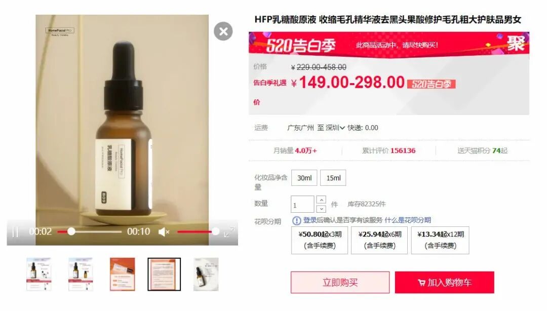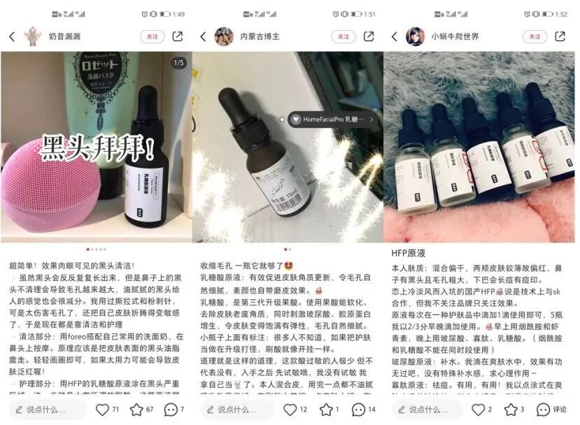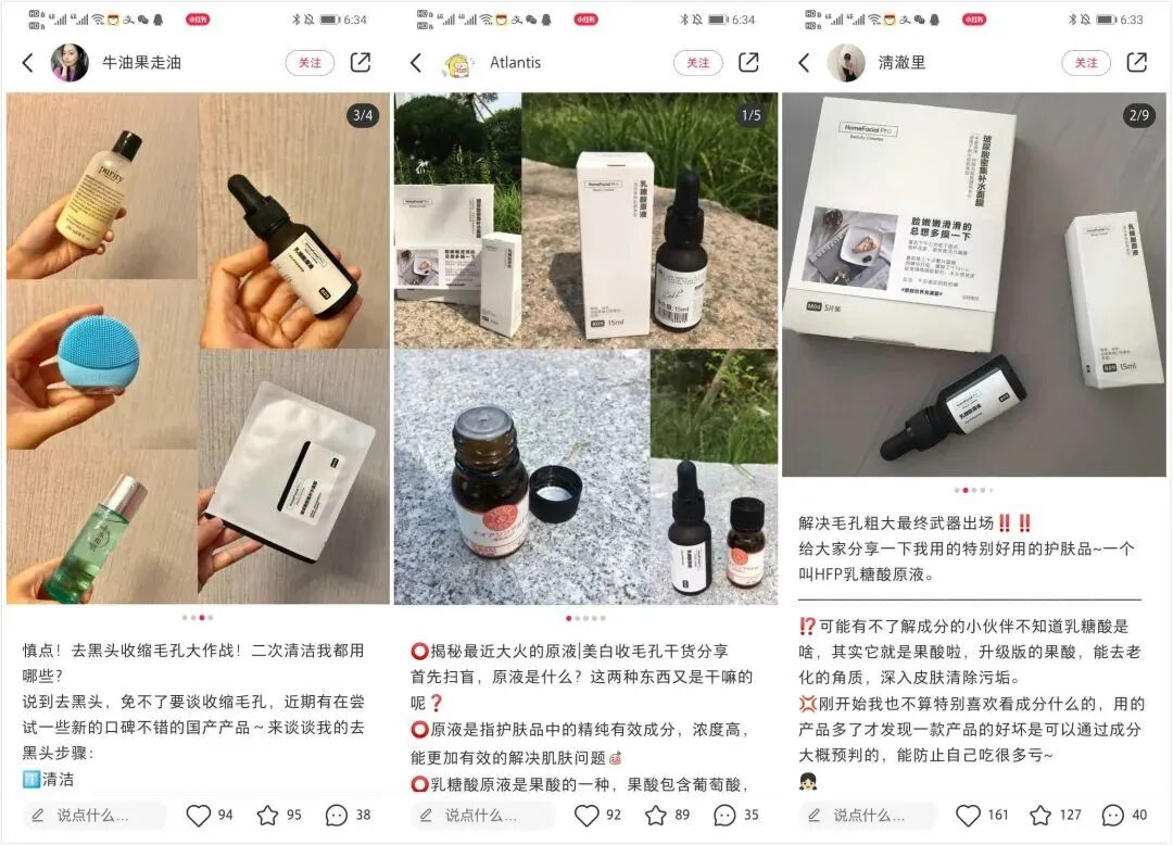 所有天猫个护品类的老板,电商运营或许永远都在思考两个问题: 1.如何将一个产品快速打造成月销数百万的爆款? 2.当一个爆款产品历经较长的生命期之后,到底该如何运营和维护它? 关于这两个问题,国产护肤品牌HFP给到了非常完美的解决方案,并成功应用在旗下产品系列的推广中。 比如说HFP的经典产品-乳糖酸原液。 该产品以收缩毛孔为主打卖点,自2018年7月上线后,利用小红书多篇爆款文章的种草,一炮而红,迅速在当年11月销售额突破月销700万,成为HFP的一款超级爆品。 而这款乳糖酸原液历经近一年的销售之后, 在2019年11月,HFP又将它包装成另一个SKU(我们简称为乳糖酸B款)上线。 HFP将上线过的乳糖酸原液又包装成另一个SKU 乳糖酸原液B款上线后,通过在抖音平台的强力推广,同样拉出一条迅猛的增长曲线,从月销180万,快速冲到了月销3500万。 乳糖酸原液B款上线后,销量一路冲高 (数据来自近场电商) 同样的乳糖酸原液,同样的包装,同样的卖点,甚至该爆款已经销售了一整年。 销售数据来自近场电商预估 HFP却通过不同渠道的营销投放,将它反复卖成爆款,堪称教科书级的市场推广案例。 那在这场“爆款复制”的案例中, HFP具体都做了哪些操作? 有哪些细节手段值得我们去借鉴,去复用? 接下来,我将通过近5000条数据的深度挖掘,为你完整揭秘HFP的“爆款复制战术”。 01 天猫个护类新品的引爆, 在小红书种草要做到“两大拉升” 我们首先来看HFP是如何将乳糖酸原液第一次打造成爆款的。 在2018年7月,乳糖酸原液A款首先上线, 对于护肤,个人护理品类的新品上线推广,HFP已经有了一整套专业化打法: 即通过在小红书平台的投放拉升,迅速的轰开单品销量。 这种拉升分为两个维度, 一个维度是投放数量的拉升。 在乳糖酸原液A款上线后,HFP迅速在小红书进行了两个月的内容铺垫。 两个月后,HFP便进行了一轮大规模投放。 如上图所示,7月份上线后,HFP逐月增加小红书投放数量,直到10月份迅速拉升,意图将产品引爆。 第二个维度是投放层级的拉升。 在乳糖酸原液A款上线后,HFP针对该产品先集中铺了一堆素人(1-1万粉)和达人(1万-10万粉)笔记,建立产品的基本口碑。 在基础的口碑内容铺设好后,HFP在10月份,迅速通过多名几十万粉的小V,对产品进行强推。引爆产品。 品牌在小红书平台种草,应先铺口碑内容,再做大规模投放 讲到这,不得不提一下, 现阶段,有越来越多的个护品牌开始重视在小红书,抖音等平台做营销投放。 我们也经常会收到各品牌的老板们前来咨询: 品牌在小红书平台该怎么去投放? 投放的节奏是什么? 为什么我的投放没有任何效果? 更有一些品牌,在整个小红书,抖音的内容投放喜欢毛毛雨投,乱投,散投,今天铺一点,明天铺一点, 没有节奏,没有先铺口碑,没有层级的拉升, 那这种投放当然不会有任何效果了。 所以HFP的“两大拉升”是品牌在小红书投放时一定要学习的基本操作。 数量的拉升,营造产品开始不断发酵,火热,再到最后引爆的气氛,并且对于之前的目标用户进行反复触达; 层级的拉升,不仅扩大用户的覆盖面,也是从下到上,逐渐向目标用户传递出,从大V到素人都慢慢开始用这个产品,绝对靠谱。 而有些品牌一上来就喜欢在小红书猛砸大V,一上来就找大博主进行强推,这其实是非常错误的策略。 大家可以试想下, 没有任何铺垫,作为消费者的你突然看到众多大V都在推荐一个新产品, 那你大概率会认为这是广告,而不会唤醒你搜索,了解,甚至是下单的意愿。 但当你首先看到众多的普通人,小达人,都在晒这款产品,逐渐对它有了初步印象后,这时候你又看到众多大V对这款产品进行了强力推荐, 那这时候的你大概率会觉得,这款产品真的很不错,可以去搜索,了解看看,甚至是最终下单, 这才是用户顺其自然,循序渐进的消费心理决策, 而这种消费心理决策,需要靠小红书的“两大拉升”来做到。 02 打造出爆款小红书笔记 需要软性植入+最优秀的解决方案 通过在小红书投放的两大拉升之后,HFP乳糖酸原液在平台内的搜索流量开始飙升,并且在11月冲到了月销售额700余万,也是侧面印证了投放的有效性。 投放后平台内的搜索流量是否飙升一般验证着投放的有效性(本数据来自近场电商) 这时一定会有人问: 为什么我也按照HFP同样的量级,同样的层级去投放小红书笔记,却不能引爆搜索,引爆产品? 因为你投放的小红书笔记没有爆文的产生。 HFP除了投放的节奏保持的较为紧凑之外,最重要的是在投放过程中,每一轮投放都有爆文的产生。 比如在2018年8月份,HFP仅仅投了5篇小红书内容,就有一篇爆文诞生。 而在2018年9月份,HFP投了8篇内容,又有一篇内容彻底火爆。 正是源源不断的爆款笔记,让HFP用较少的投放预算,做到了ROI翻几倍的效果。 而且更加值得注意的是,HFP多篇爆文的产生,并不是来自有几十万,甚至是上百万粉丝的大小V。 根据HFP的投放数据追踪显示。只要注意撰写笔记的方法与技巧,粉丝在十几万,甚至是几万几千的KOL,都有可能写出爆款笔记。 品牌在小红书投放时不要盲目追求大V,更应该注意内容质量 那让我们来看看,HFP在爆款笔记的打造上都有哪些值得学习的点,让其每一轮投放,都能屡出爆款。 值得学习的第一点: 一定要写的足够软,不要对于自己的品牌有过多刻意的露出。 比如我们看下面这篇关于乳糖酸原液的爆款笔记。 该笔记由小红书KOL-蘑菇大大