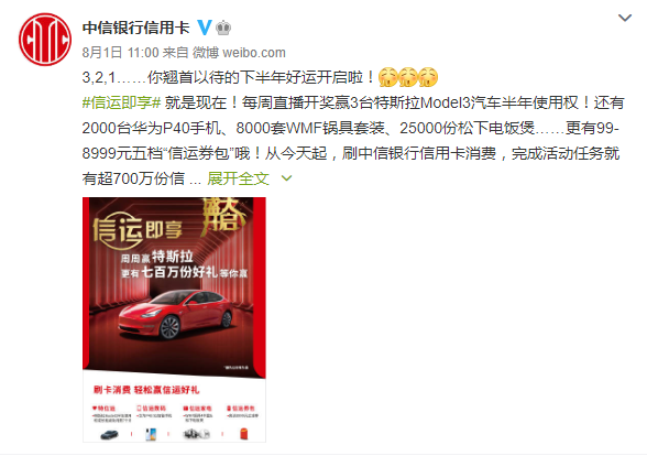 随着时间推移,后疫情时代的到来,消费者的需求出现明显变化,而则对此中信银行推出“信运即享”活动,携手特斯拉等品牌献上超额大礼,助力下半年消费、产业再升级。