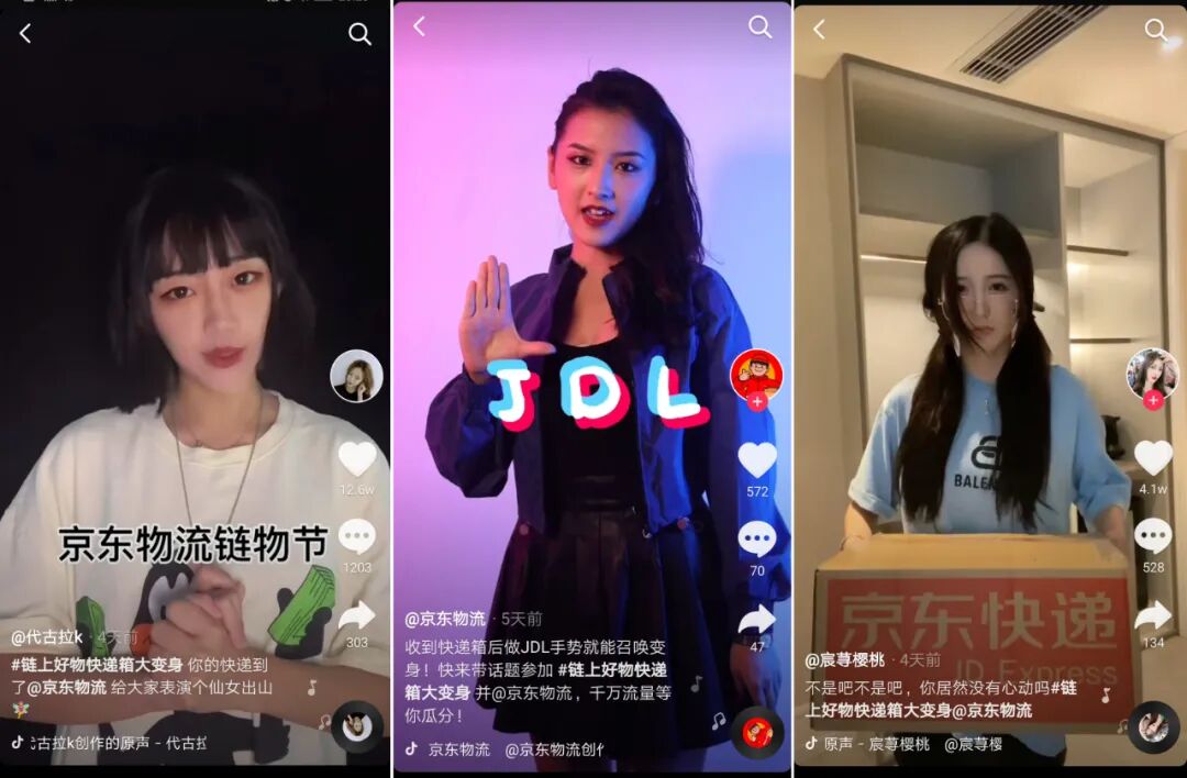 京东物流还发起#链上好物快递箱大变身#抖音挑战赛,借助抖音红人打样引导素人参与,衍生众多优质的UGC内容。在这个过程中,品牌巧妙将自身logo转化成特色手势舞,使其成为一种社交货币,强化大众对于JDL符号的认知。