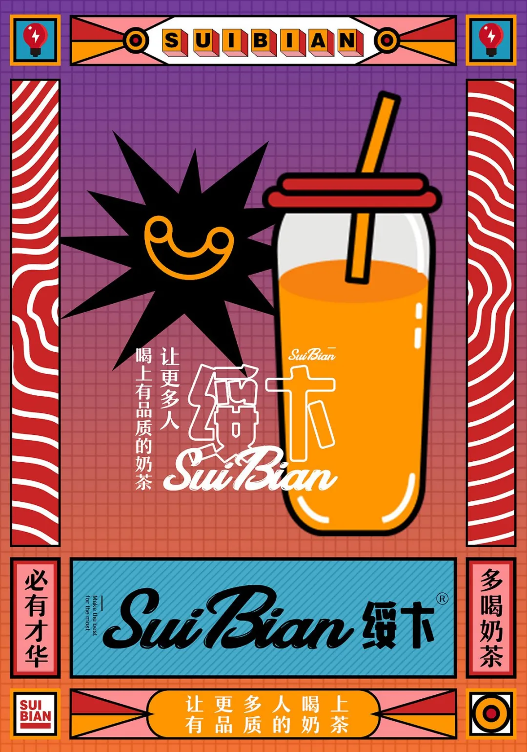 奶茶海报海报通常都会用实拍产品图片来勾起消费者的食欲,设计风格也多为清新、甜美的感觉,而下图的奶茶海报却采用了扁平、抽象的波普风格,颜色搭配也很时尚,让人眼前一亮。