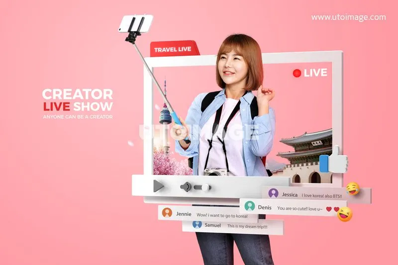 在上图中,设计师把直播的元素全部从手机中分离出来,然后与正在做直播的主播组合在一起,将旅游直播有趣地视觉化,背景没有使用实景,而是用了纯色块,形式很新颖,也很时尚。