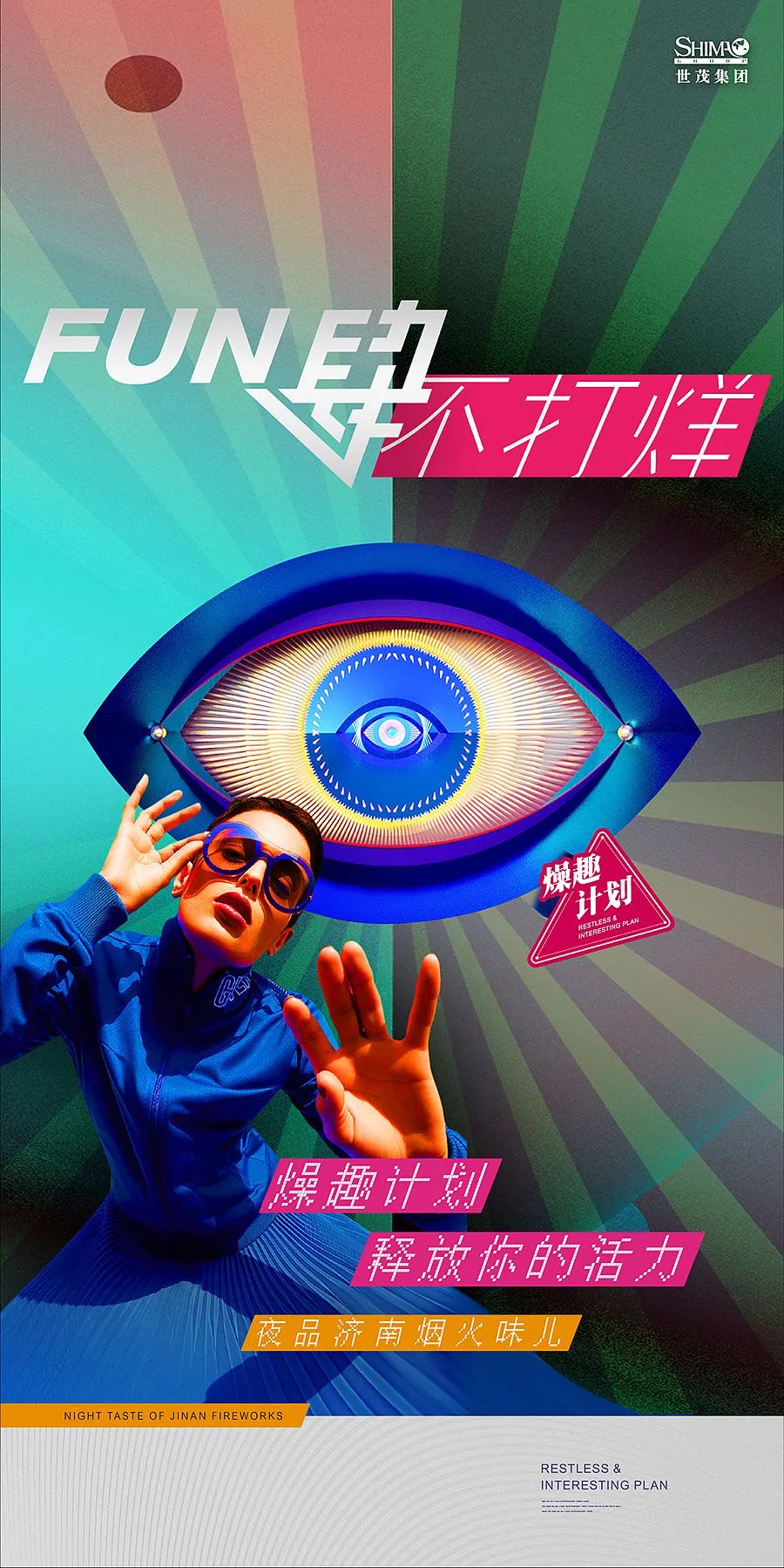 该海报也是采用了混搭的手法,复古风的背景、矢量风格的眼睛、摄影素材(女模特)搭在一起,给人一种不寻常的视觉感受,另外,看似没什么关联的三个元素其实也是有关系的,从人到眼睛,再到背景其实是一个递进的关系,因为眼睛来自于前面的人,而发散的背景来自于眼睛。