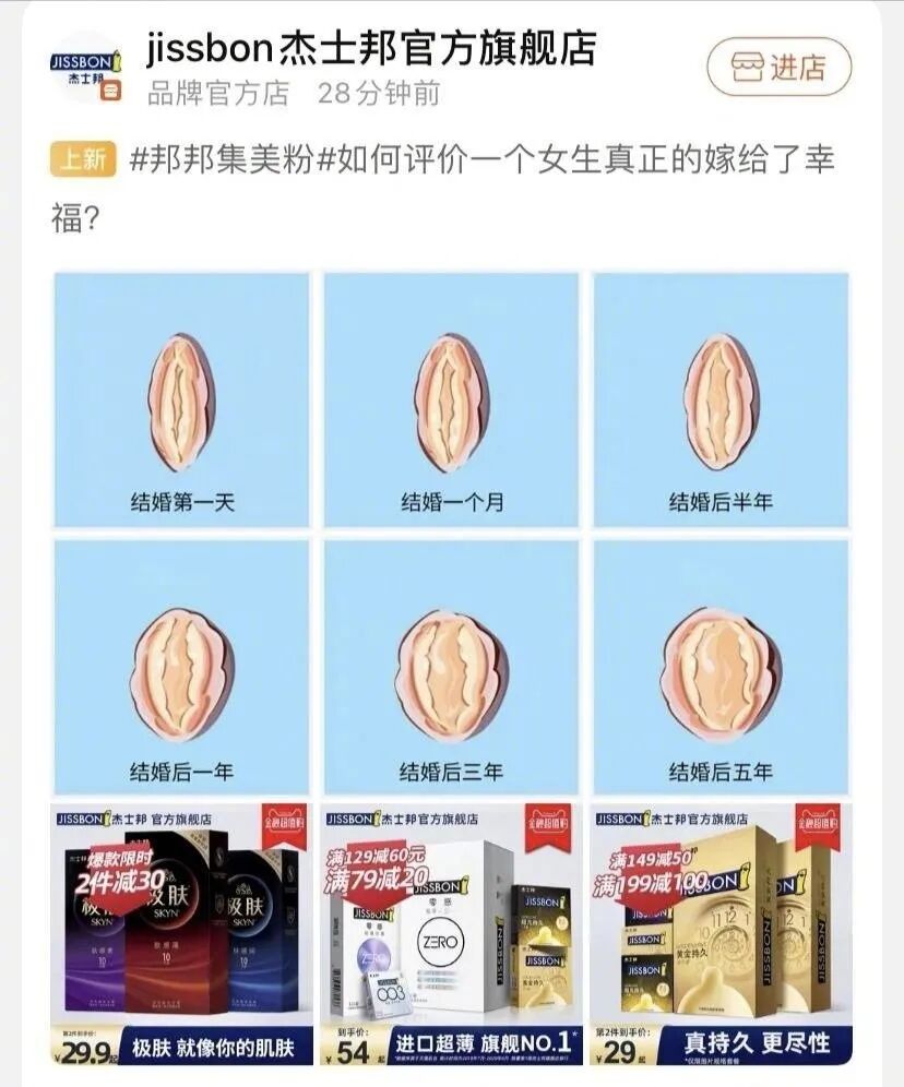 而这次处罚让很多网友自然联想到了前不久同样是避孕套品牌的杰士邦,发了一条微博:如何评价一个女生真正嫁给了幸福?配得画面极度低俗无脑,一度被网友骂上热搜。