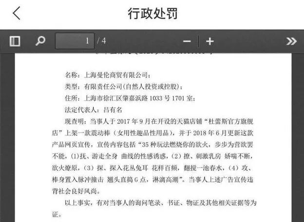 点进去看才发现,原来这是7月8日就发布的行政处罚,是对杜蕾斯关联公司上海曼伦商贸有限公司的。处罚金额为81万元,处罚事由为发布广告含有淫秽、迷信、恐怖、暴力、丑恶的内容。