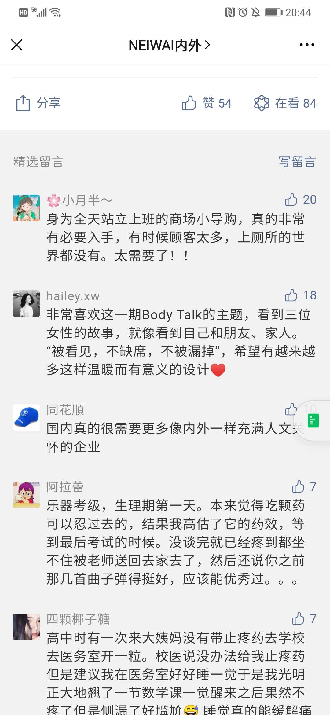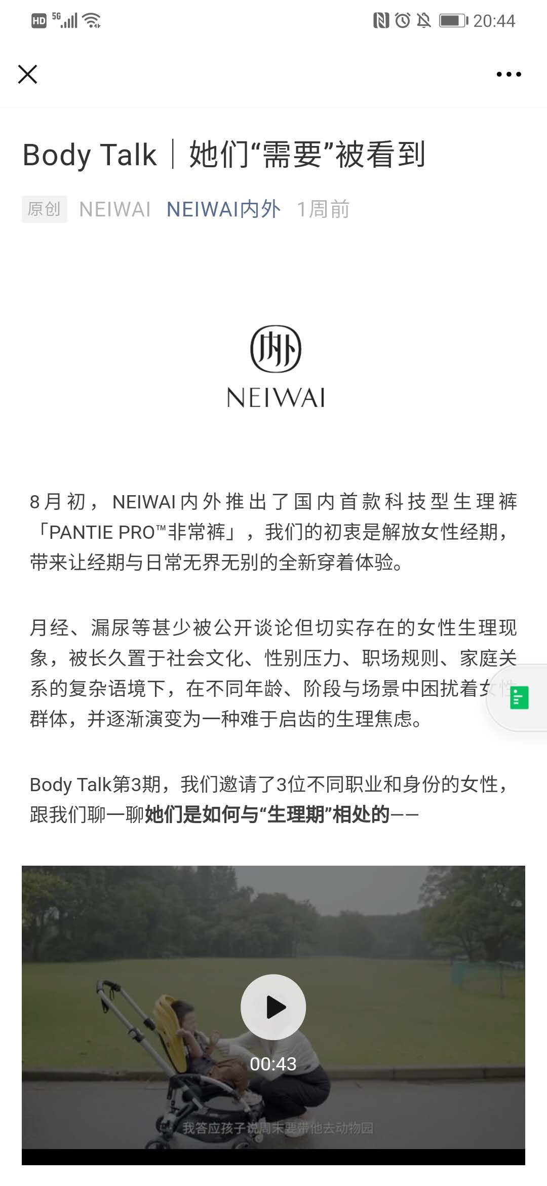 比如,在官方自媒体平台上,内外每个月都会针对女性议题发起关于【Body Talk】 的开放式讨论,如「胖女孩们开始唱歌 」、「乳房可以被谈论吗」。
