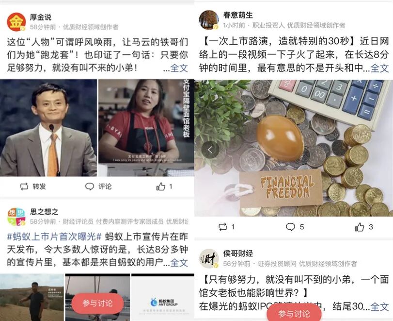 另外,头条优质KOL在今日头条平台上对上市片进行解读,形成了#蚂蚁上市片首次曝光#话题宣传条,吸引更多的用户和KOL产出海量UGC内容,跨平台将话题进行发酵扩散。这些头条KOL,是来自不同领域圈层的优质创作者,他们是资深媒体人、教育领域的创作者、财经领域创作者、科技领域创作者、情感领域的创作者等。他们用自己专业领域知识输出观点和思考,作为内容的转化承接,引发二次UGC扩散发酵,盘活长尾传播效应,增加品牌活动的声量。以用户视角讲故事