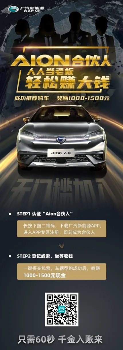 “Aion合伙人”打破了传统汽车营销的条条框框,彻底打破了入行的高门槛。不管是汽车圈内的专业人士还是完全不懂车的圈外人,都可以通过广汽新能源APP注册成为“Aion合伙人”,并推荐广汽新能源汽车有限公司的零售客户产品Aion S魅和Aion LX。当合伙人推荐的客户成功提车后,即可申请收益提现。“Aion合伙人”不需繁琐流程就能轻松获得收益。作为合伙人,只需要提供有购车意愿用户的线索,后续则由相关人员来说服购买。每成功交易一单,便可轻松收益1000-1500元。最重要的是,广汽新能源将为所有Aion合伙人提供强大的技术和售后支持,保障品质服务。合伙人介绍成功即完成工作,不需要背负任何负担。