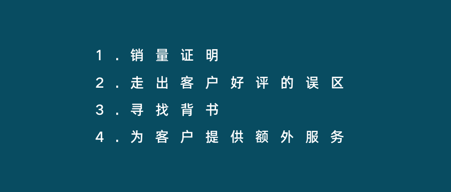 把客户可能的顾虑的东西一一列出来,再告诉她解决方案,他得到的额外信息和服务越多,对你的产品就越信任。