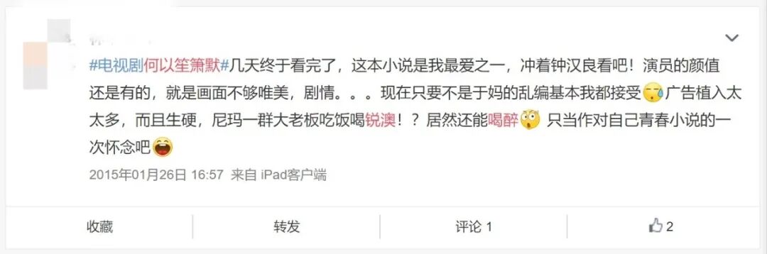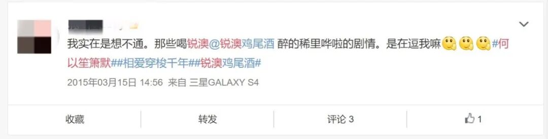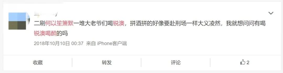 还记得2015年RIO赞助《何以笙箫默》《杉杉来了》等热门偶像剧,当时剧中有一个情节,一群人吃饭喝锐澳,然后喝醉了。第二天就引来微博上的疯狂吐槽: