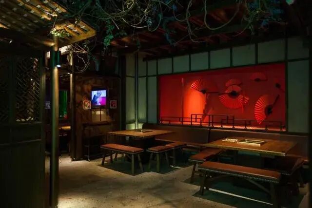 顶梁柱被设计成了传统的中式屏风隔断,其中又藏着古代常用的花纹图样,四周又被设计成了宫楼楼角的样子。两种不同的中式灯笼挂满了整个空间,并且各有各的颜色,各有各的用处。还有墙上的背景画,是中国古典故事《山海经》的系列插画,无论是山水、祥云还是百鬼都直接呼应了主题“山海极乐”。