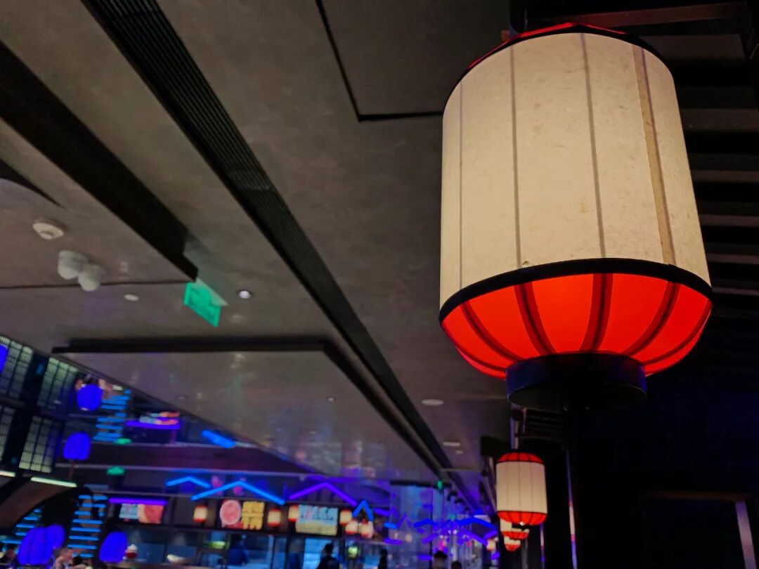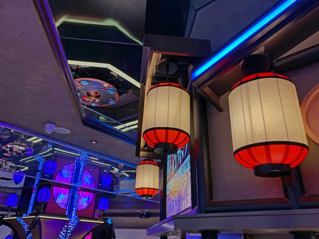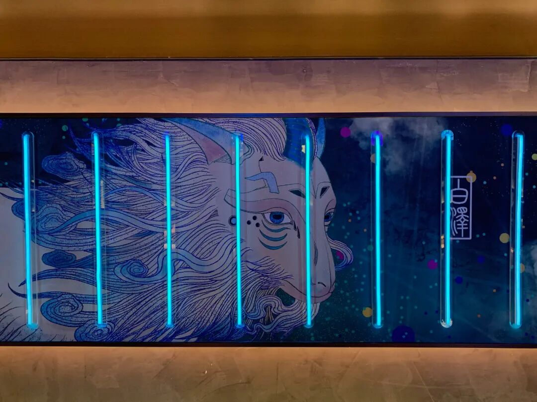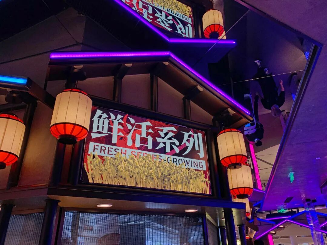 几处装有大片的亚克力板,上面用荧光色的灯管“写”满了“极乐川味”“人间”“系统正常”等等字样,瞬时有一种处在了人机共存的未来世界!不得不说,川味观这次真的很猛,完全颠覆了传统火锅给我们的印象,直接来了个彻底的大改造。但它的空间设计中只有未来感吗?不,走着走着你会发现,中式风格也随处可见,而且处处用心,处处惊喜。