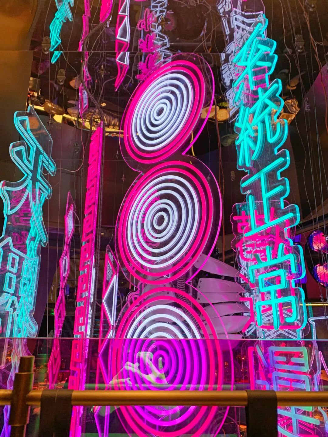 果然,踏进门的那一刻,整个空间被蓝、绿、红、粉几个主色灯光笼罩着,看起来像是一座夜晚刚刚降临的未来城市。