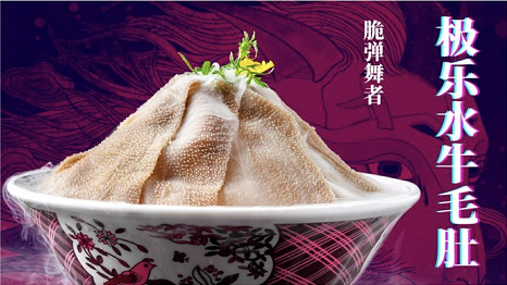 接下来几个店铺内部镜头迅速地切换、转场,轻而易举地在我们的脑海中,描绘了一幅关于未来城市的蓝图。再来看菜单部分的设计,依旧紫色为主色,文字被处理成故障艺术风格,而其中不能忽略的是背景中的插画,再一次的点题“极乐山海”,并对应了店铺内的装饰画。看起来是整齐的排版,规矩的字体,精美的食物,但仔细一看每一道食材的背景中,都藏着一个神物。不得不说,川味观的这次“极乐山海”主题,真的赞爆!没想到它不仅火锅做的好,玩起设计也是数一数二!