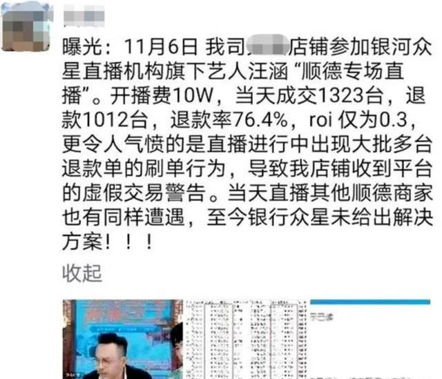 有参加汪涵直播间的商户在朋友圈发文称,11月6日,该司电商店铺参加银河众星直播机构旗下艺人汪涵“顺德专场直播”。开播费10万元,当天成交1323台,退款1012台,退款率76.4%,ROI仅为0.3,“更令人气愤的是直播进行中出现大批多台退款单的刷单行为,导致我店铺收到平台的虚假交易警告。