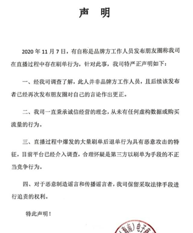 11月12日,汪涵签约的直播机构上海银河众星电子商务有限公司发布声明称,该司从未有任何虚构数据或购买流量的行为,“合理怀疑是第三方以刷单为手段的不正当竞争行为”。