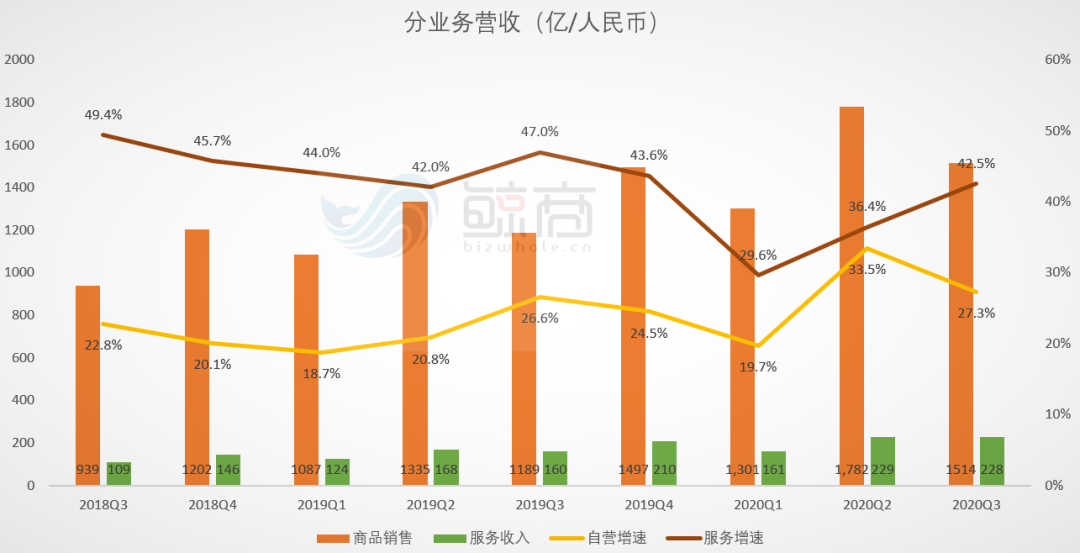 分业务来看,京东2020Q3商品销售收入1514亿元,同比增长27.3%;服务收入达到228亿元,同比增长约43%,占整体净收入的比例首次超过13%。