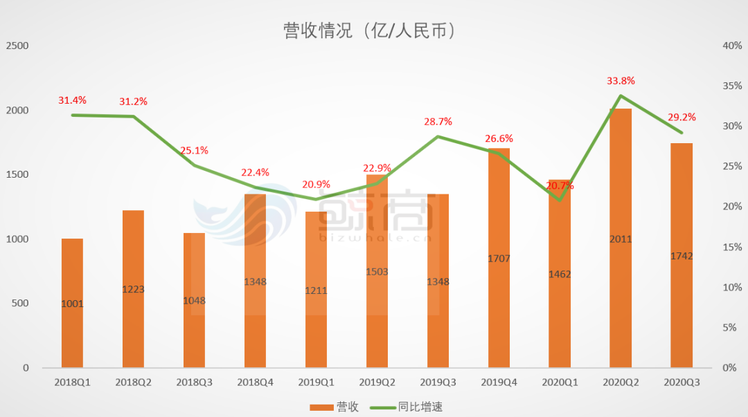 京东2020年Q3营收为1742亿元,同比增长29.2%,略高于2019年同期的增长水平。相比上一季度超过2000亿的营收有所下滑,主要是受季节性消费及618营销活动的影响。