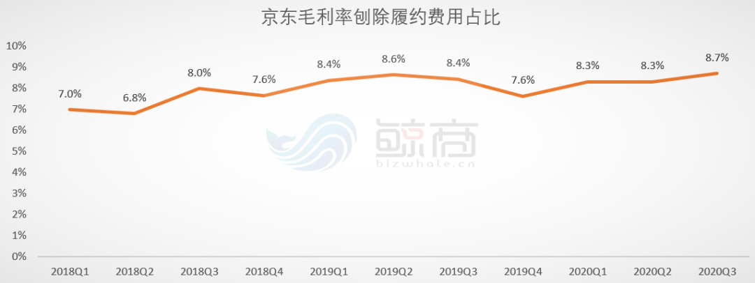 京东单季毛利为268亿元,去掉履约费用占比,整体毛利率为8.7%,高于往期水平,主要原因可能是用户消费从低频率转为高频率,及规模效应下,销售运营成本降低。