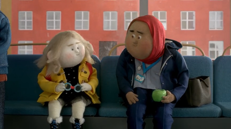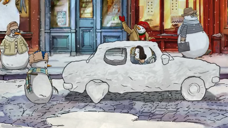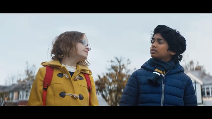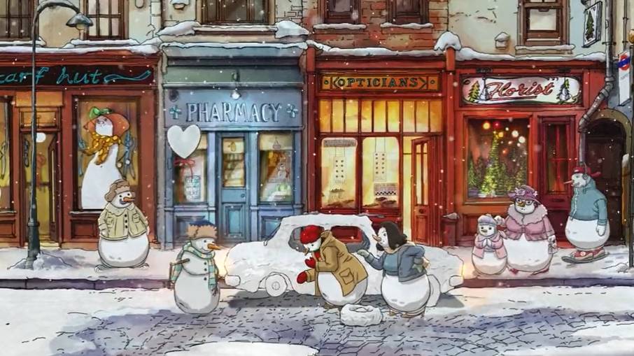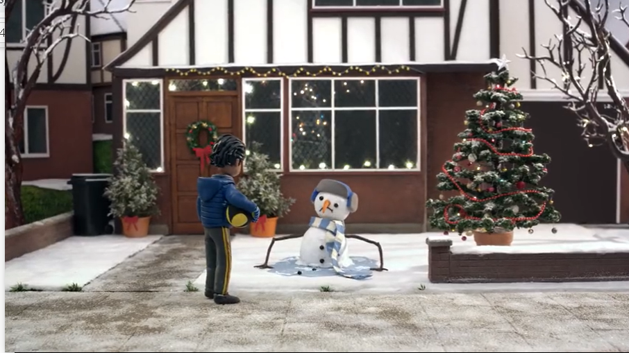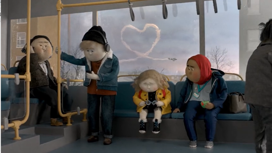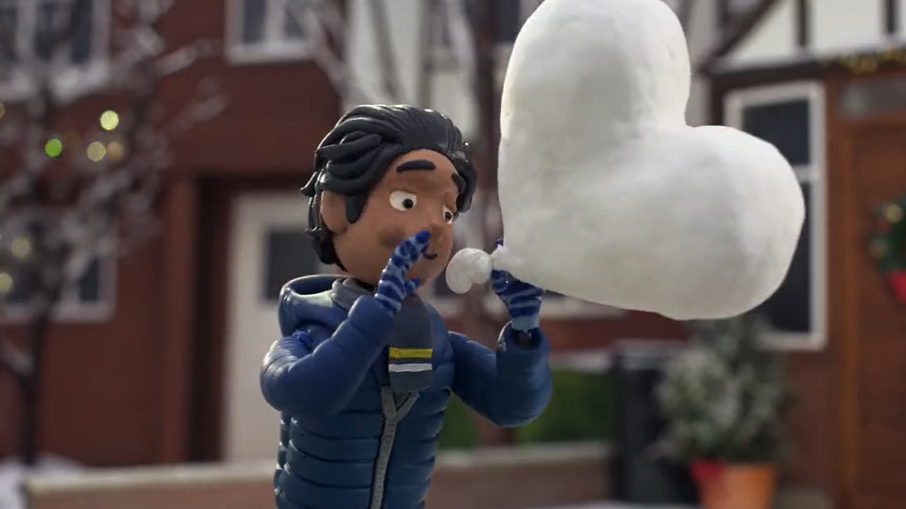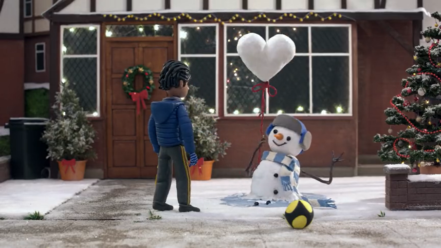 与以往的「礼物 Gift」主题不同,今年的短片以「善意 Kindness」与「爱 Love」为主旋律,伴随着英国歌手 Celeste 为广告专门谱写的歌曲《 一些爱A Little Love》,演绎了一颗爱心在人群间传递的温暖故事。John Lewis 圣诞广告的老搭档,创意代理商 Adam&eve DDB ,在这一次携手 8 位艺术家,通过影视表演、黏土、水彩、电脑三维技术、毛毡等多种视觉表现手法,将观众带入梦幻般的故事氛围中。几乎每一帧画面,都值得仔细观看。故事开篇,小男孩望着挂在树枝上的足球叹气。一位穿着黄色外套的小女孩路过,将她的雨伞撑开飞向树枝。雨伞瞬间打开成一颗红色的爱心,足球顺利从树上落下。告别女孩,小男孩在路旁遇见了一个奄奄一息、快融化了的雪人。他拾起路边的积雪,吹成了一颗爱心形状的气球,送给雪人。雪人接过气球,身体瞬间变完整,飞向高高的天空。